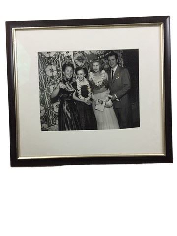 Framed vintage Hollywood photo. Brown picture frame with gold inner lining and glass. Actors attending a luau themed event. Image is in black and white. An artcare Bainbridge seal is stamped on the back of the frame. Measures 30 1/2" x 34". From Todd Fisher/Debbie Reynolds Archives Collection. Oversized item, will require third party postal packing and shipping charges.