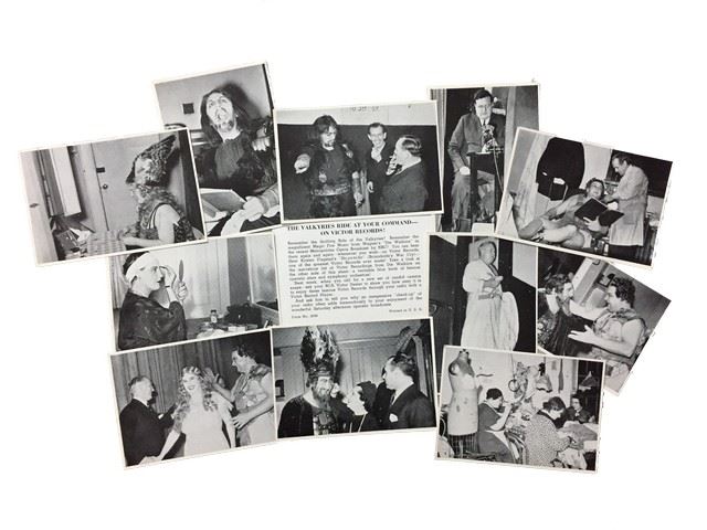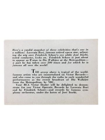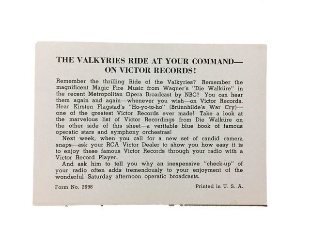 Two sets of rare and vintage promotional items (~24) from the Metropolitan Opera ca. 19th Century (approx. 4 x 3 in). These are exclusive candid camera shots of the Great Stars of the Metropolitan Opera, RCA Victor stars of the opera Die Walküre and La Traviata. These rare black and white photographs are printed on paper and verso is a caption about the image. There are images of famous stars as well as images of those connected with the productions such as: "Die Walkure" with Lucrezia Bori, Milton Cross, Kirsten Flagstad, Ludwig Hofmann, Lauritz Melchior, Friedrich Schorr, Jose Ituri (conductor). The stars and those connected with the production of "La Traviata" are Vina Bovy, Lucielle Browning, Nino Martini, Ettore Panizza (conductor), John Charles, Thomas, Thelma Votipka. All camera shots are in very good condition and come in the original blue and green envelopes. There is water damage, holes and tears to the envelopes. Flaps are missing. Printed on the envelope of La Traviata is “Form 2697 and Printed in the U.S.A. “ Printed on the information card and the envelope of Die Walküre is “Form 2698 and Printed in the U.S.A.“