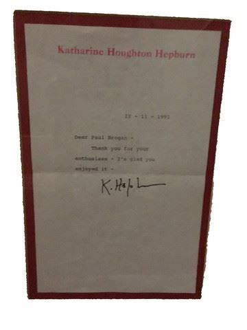 Accompanying this exceptional item is a Certificate of Authenticity (COA), ensuring the genuineness of Katherine Hepburn's signature.
