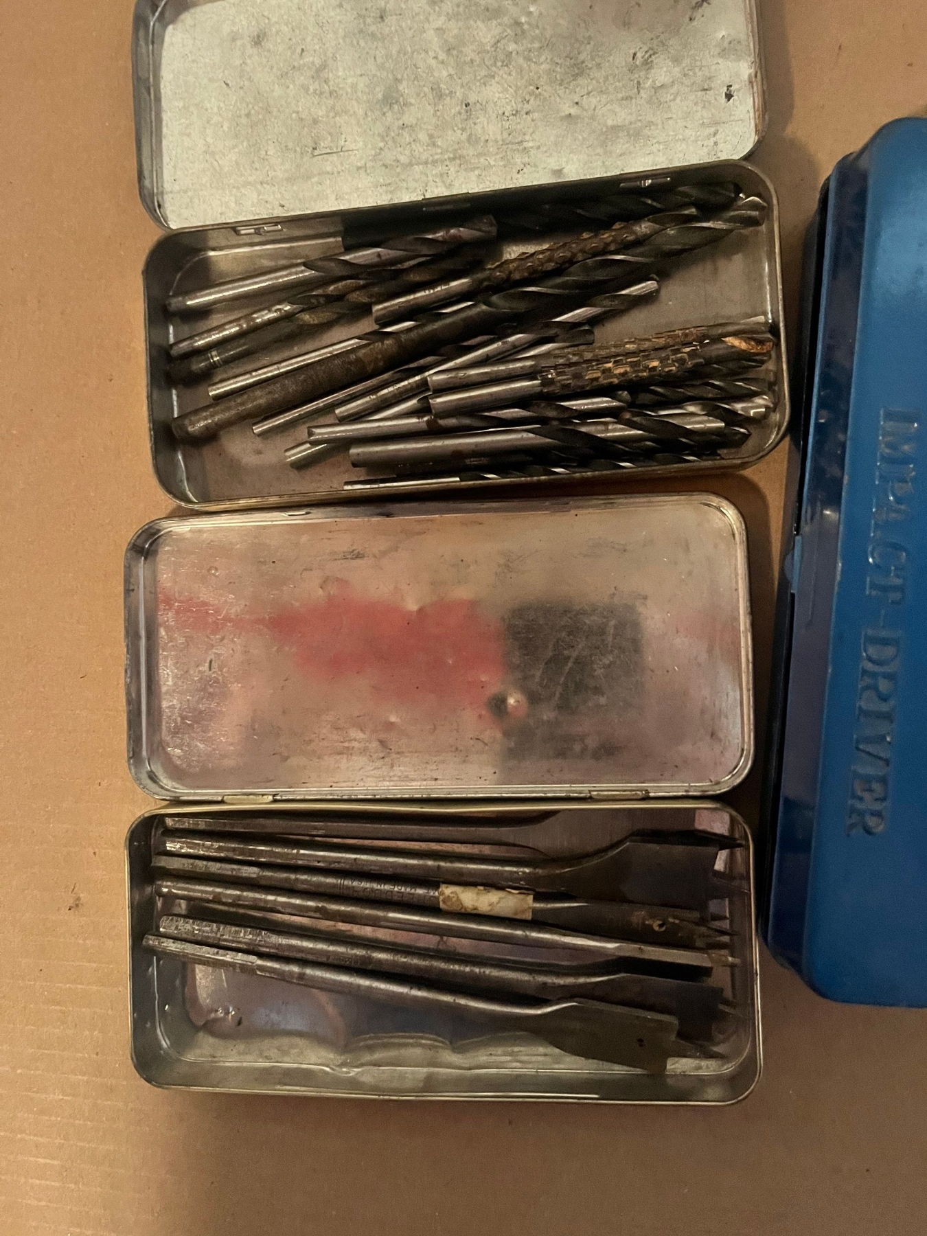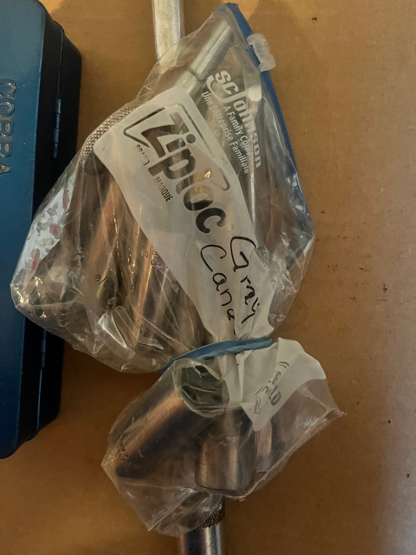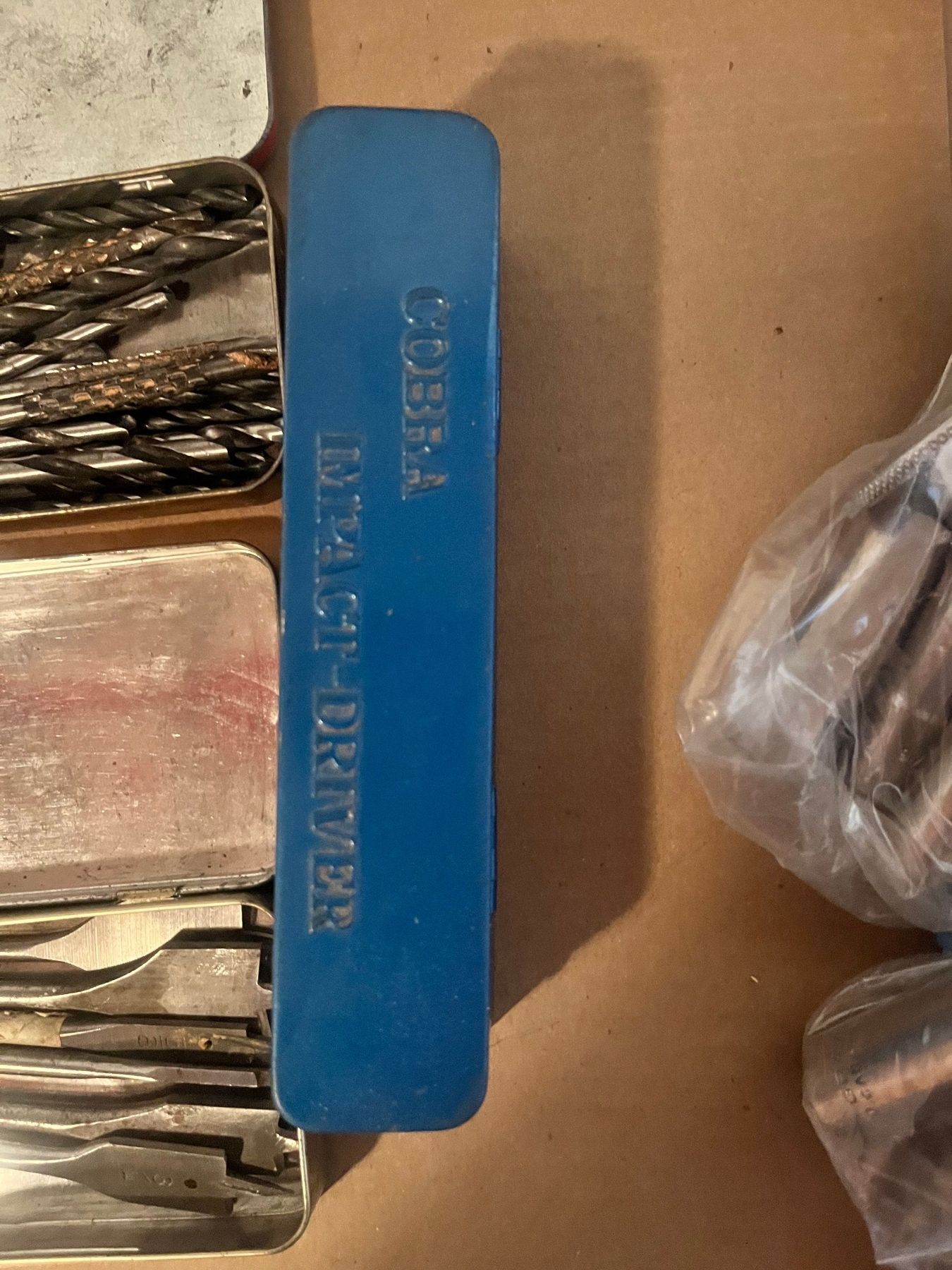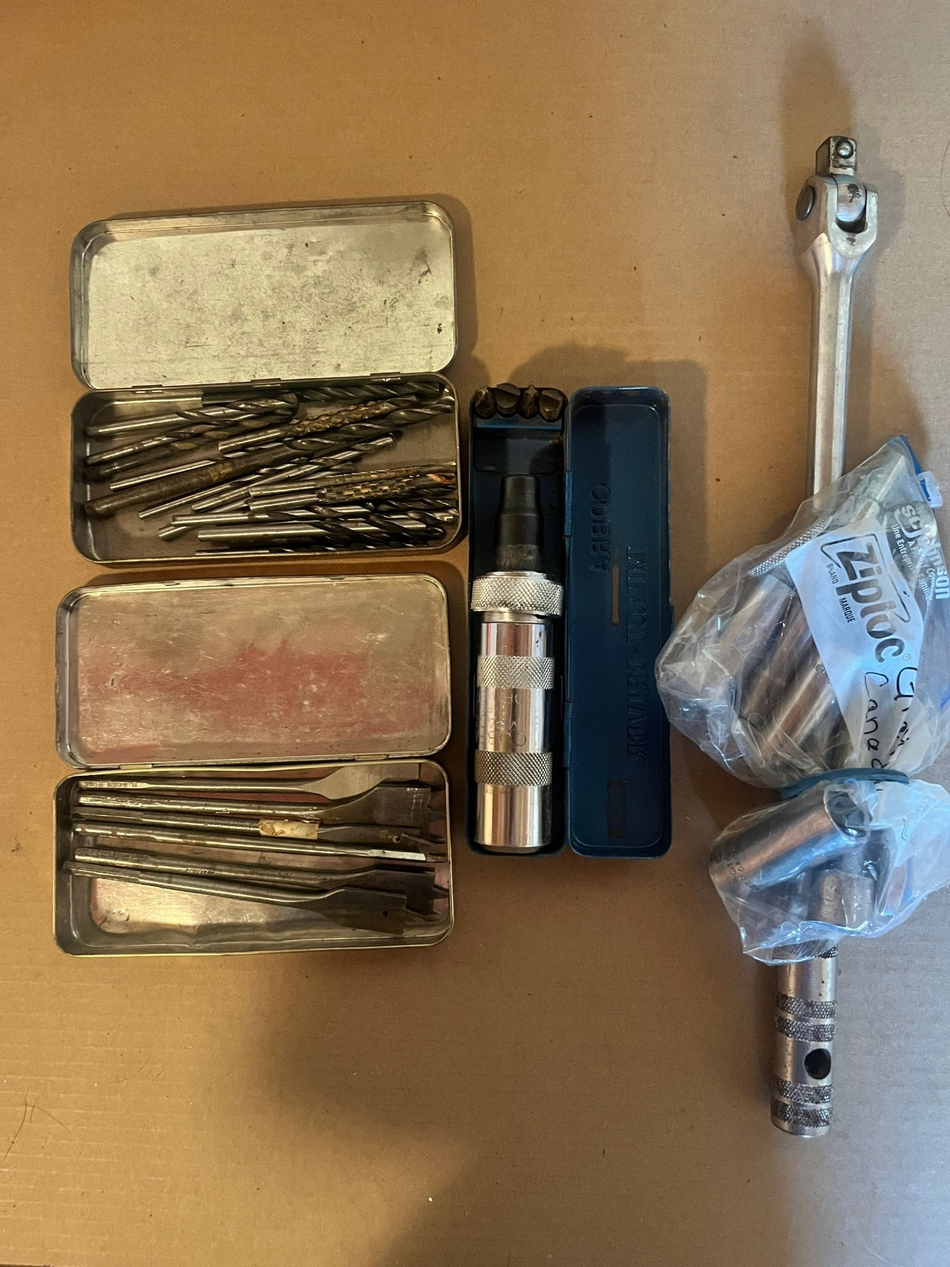 Gray Canada socket set, cobra impact, variety of drill bits and spade drill bits.