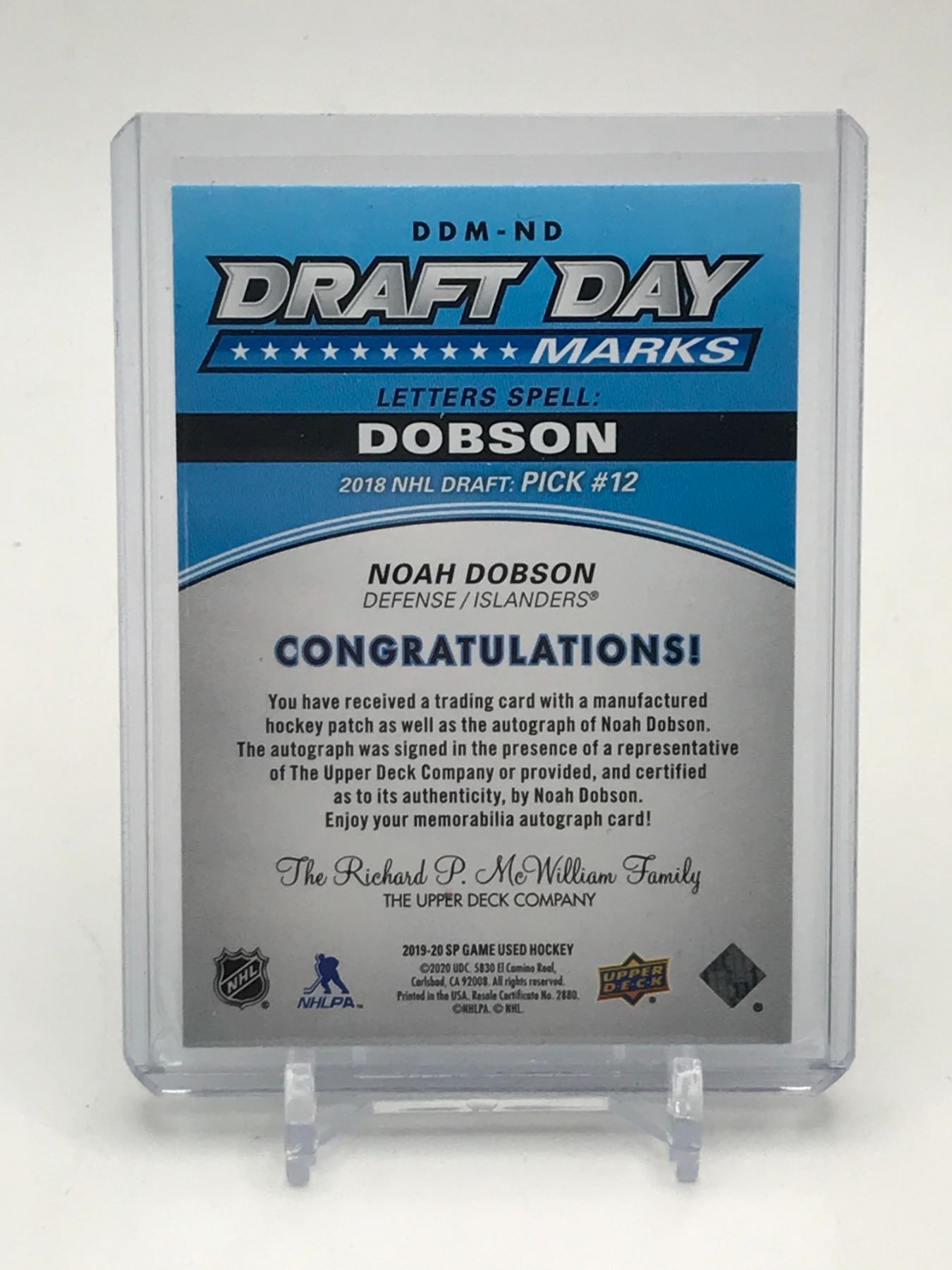 Lot 28 2019-20 UPPER DECK SP GAME USED HOCKEY NOAH DOBSON SIGNED PATCH DRAFT DAY TRADING CARD 01/35