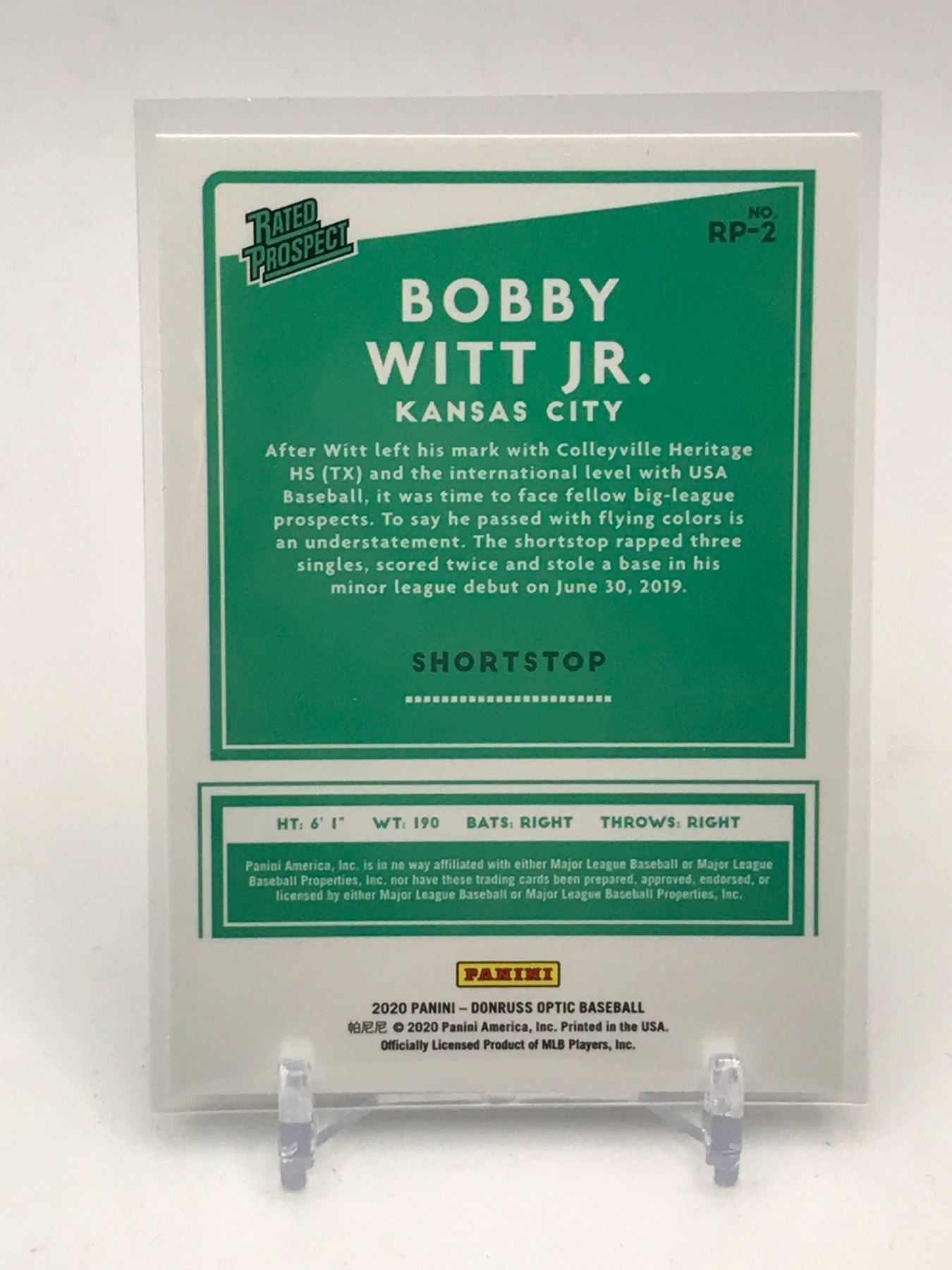Lot 55 2020 PANINI DONRUSS OPTIC BASEBALL BOBBY WITT JR. RATED PROSPECT TRADING CARD