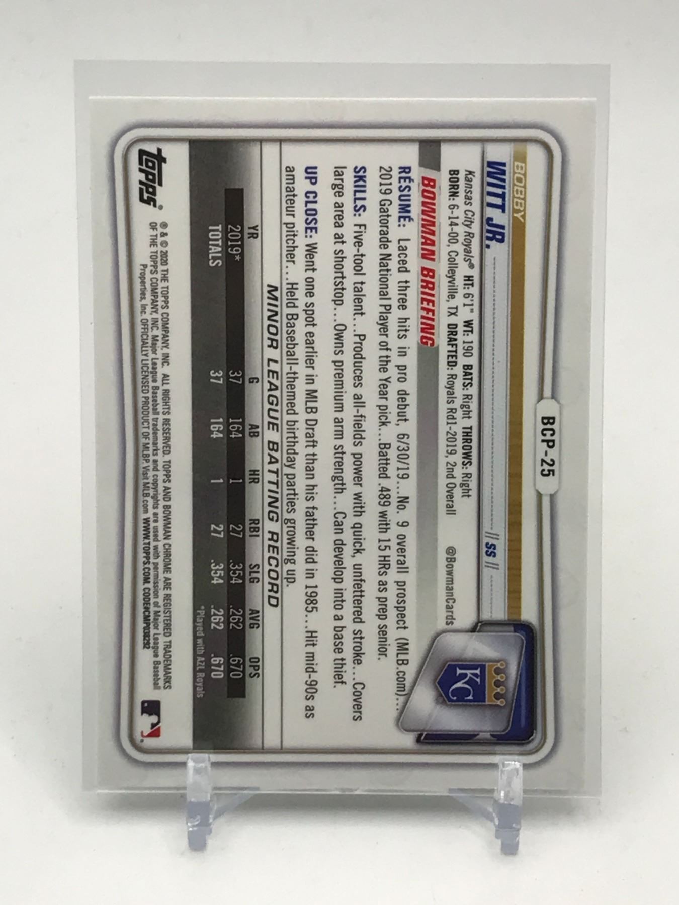 Lot 66 2020 TOPPS BOOBY WITT JR 1ST BOWMAN BASEBALL TRADING CARD