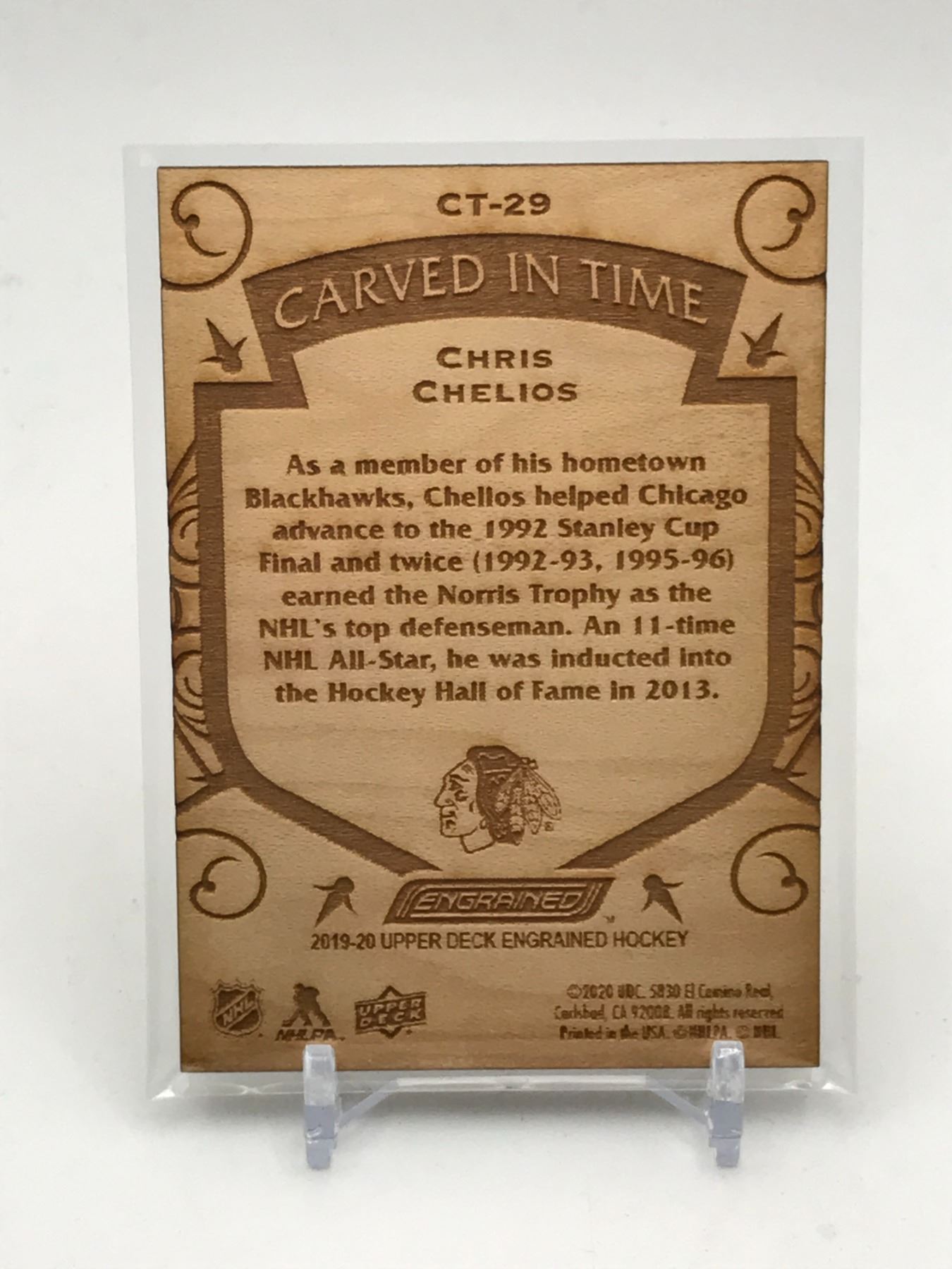 Lot 179 2019-20 UPPER DECK ENGRAINED HOCKEY CARVED IN TIME CHRIS CHELIOS TRADING CARD