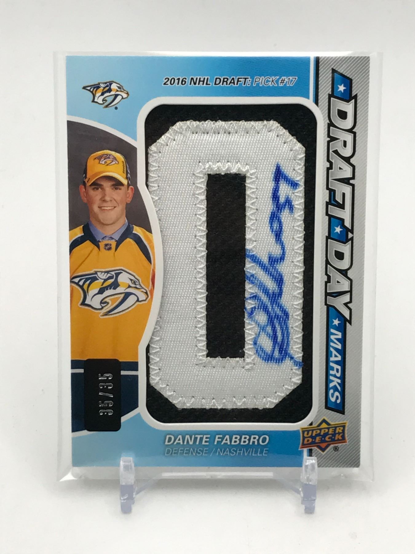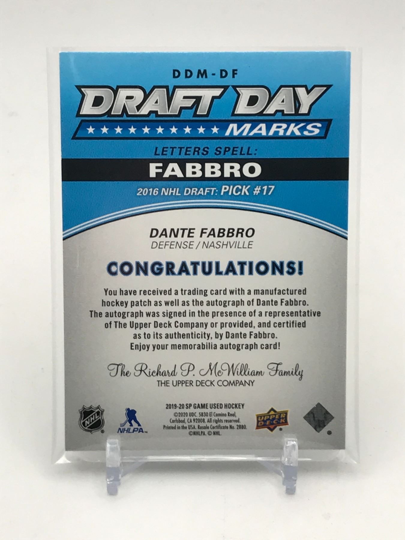Lot 180 2019-20 UPPER DECK SP GAME USED HOCKEY DRAFT DAY DANTE FABBRO SIGNED PATCH TRADING CARD 35/35