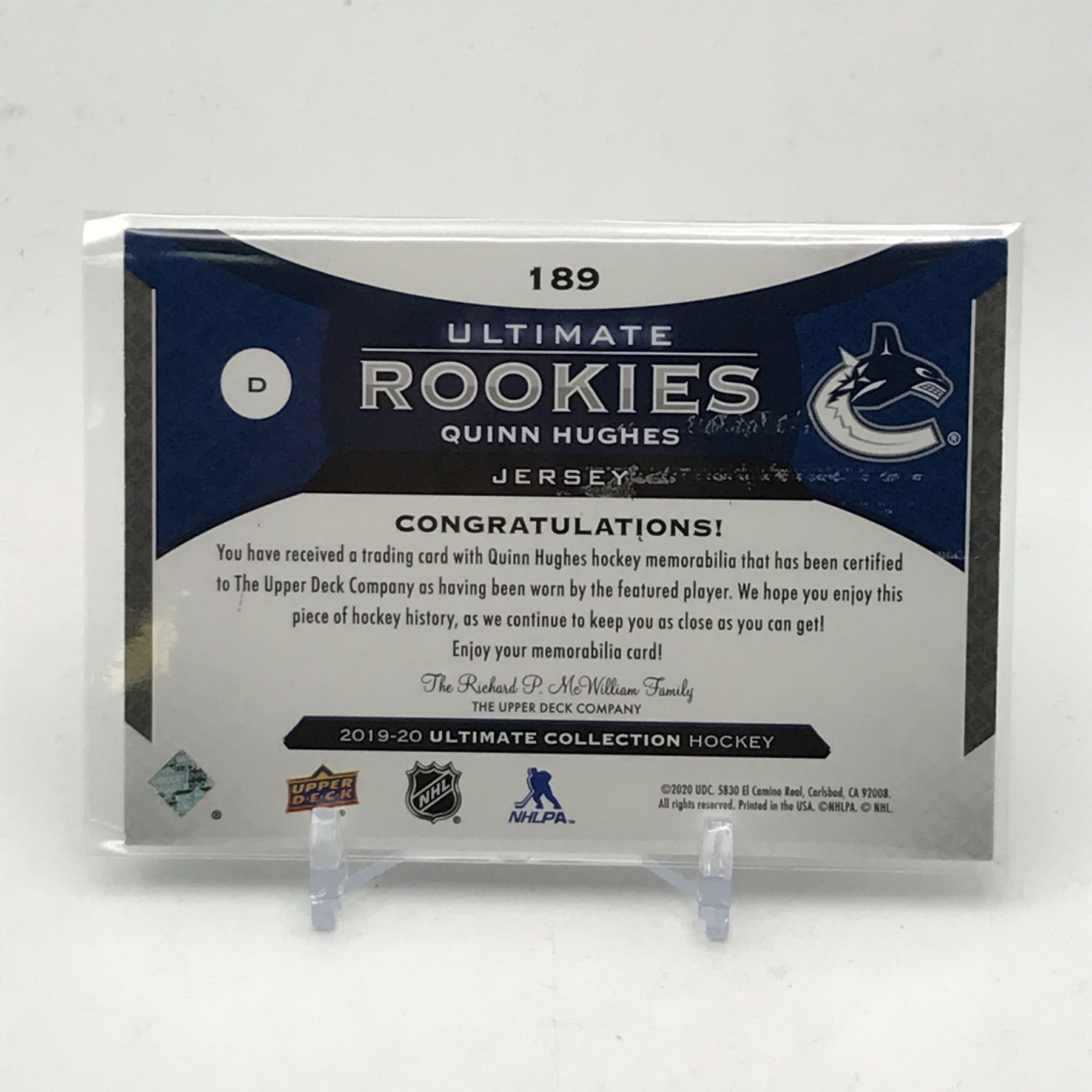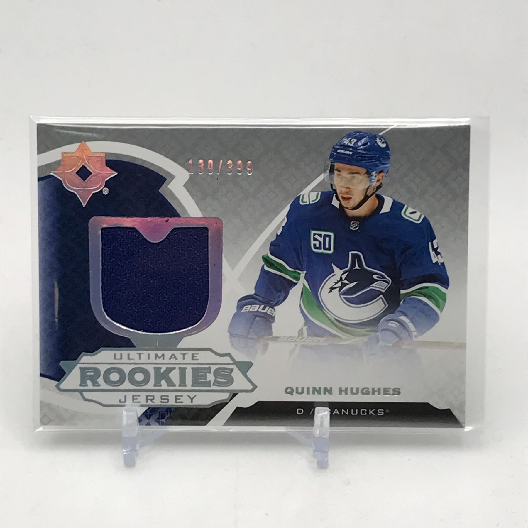 Lot 191 2019-20 UPPER DECK ULTIMATE COLLECTION HOCKEY QUINN HUGHES PATCH TRADING CARD 139/399