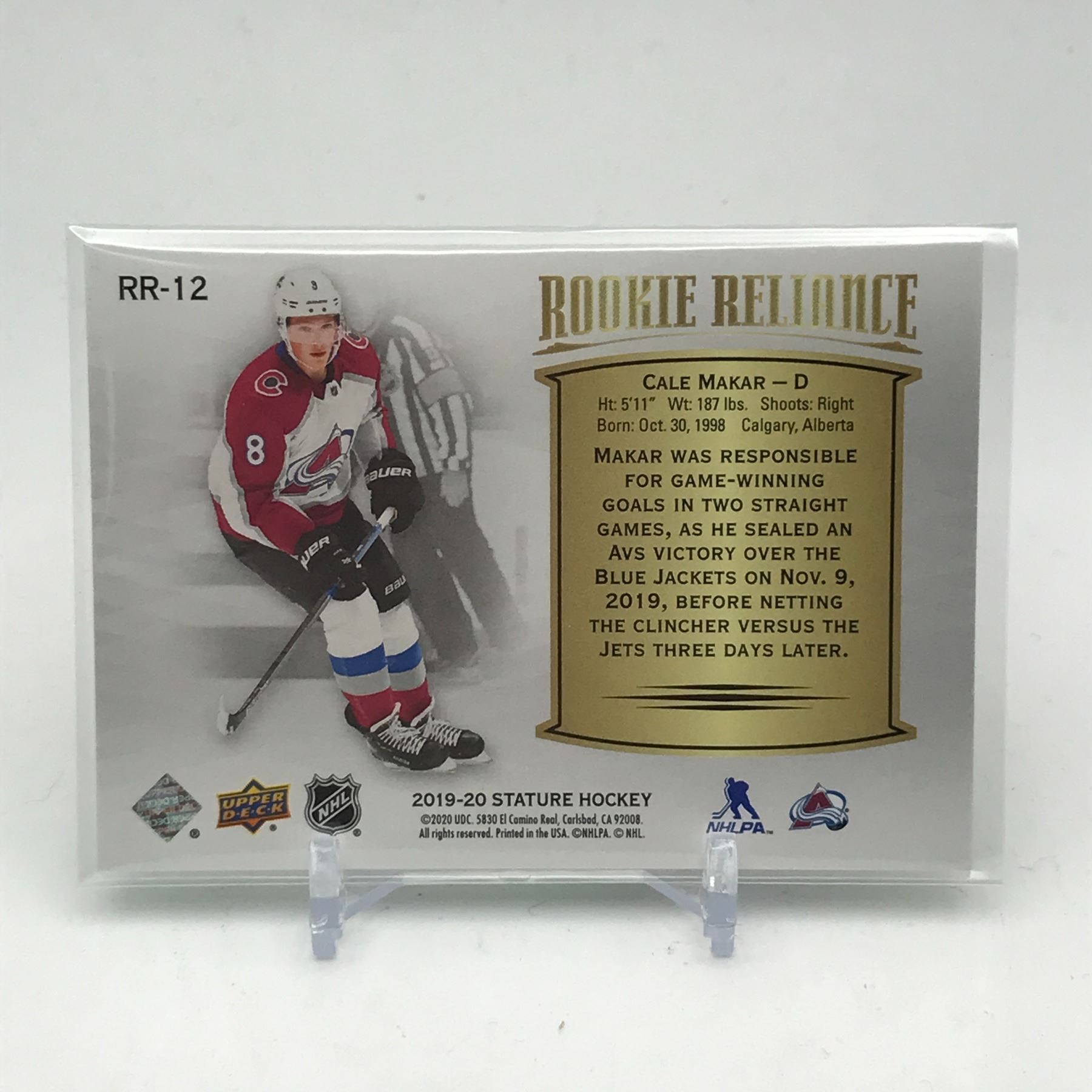 Lot 250 2019-20 UPPER DECK STATURE HOCKEY ROOKIE RELIANCE CALE MAKAR TRADING CARD