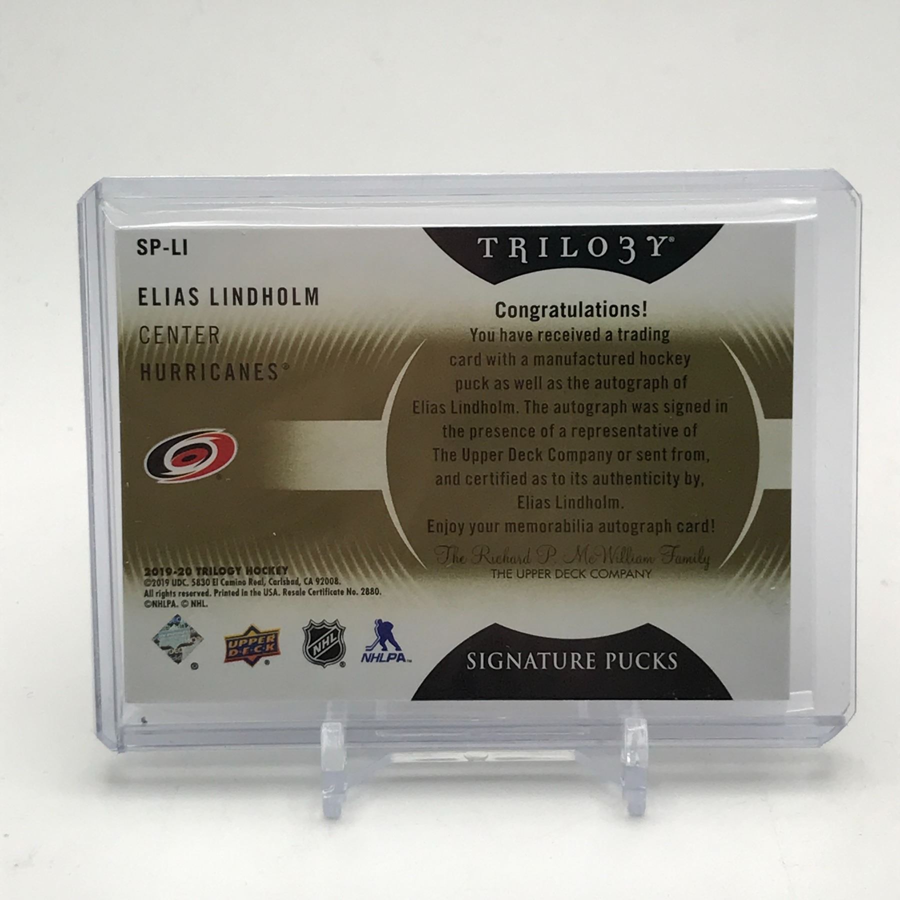 Lot 258 2019-20 UPPER DECK TRILOGY HOCKEY ELIAS LINDHOLM SIGNED TRADING CARD