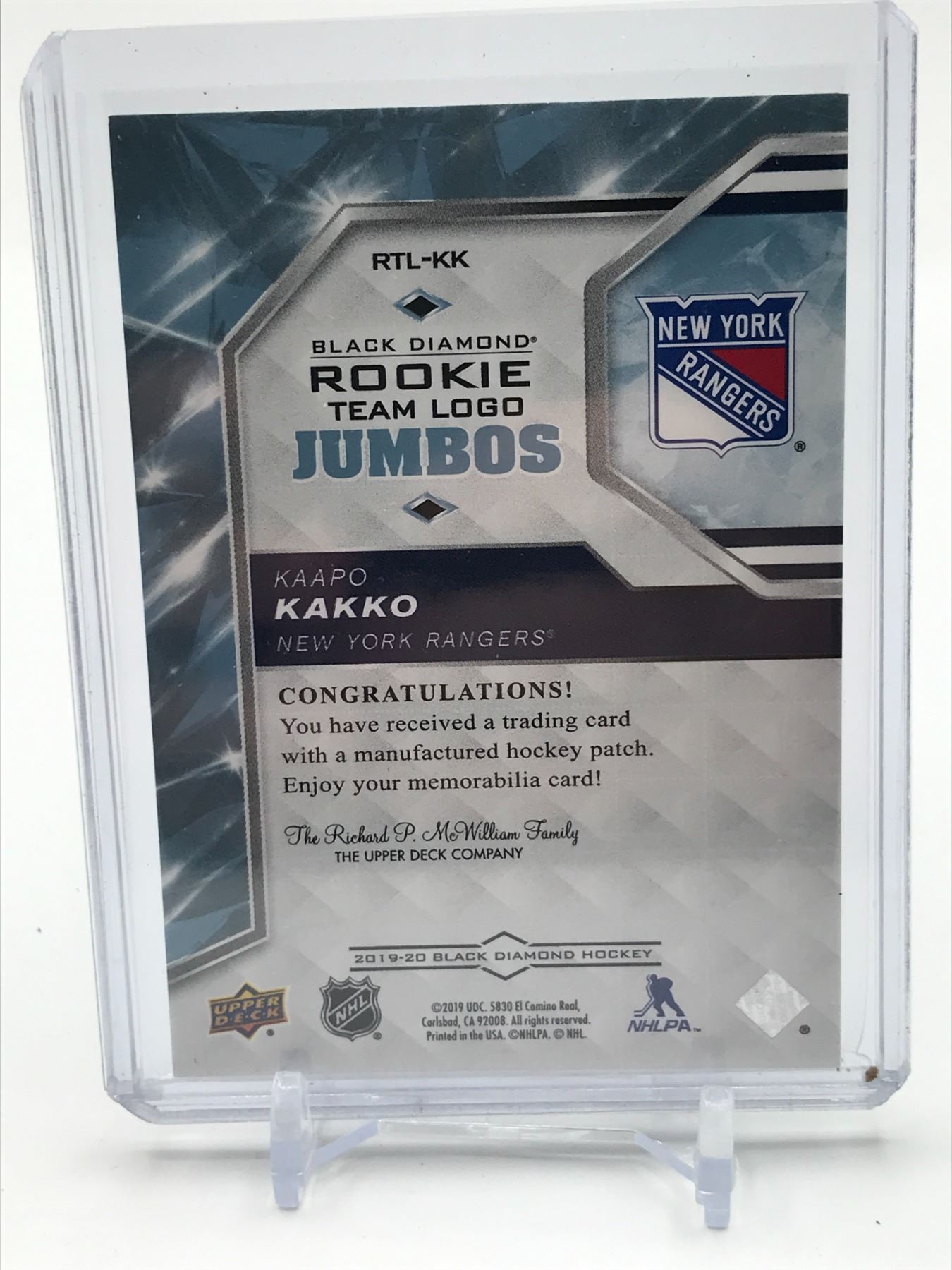 Lot 342 2019-20 UPPER DECK BLACK DIAMOND HOCKEY JUMBO PATCH KAAPO KAKKO ROOKIE TRADING CARD