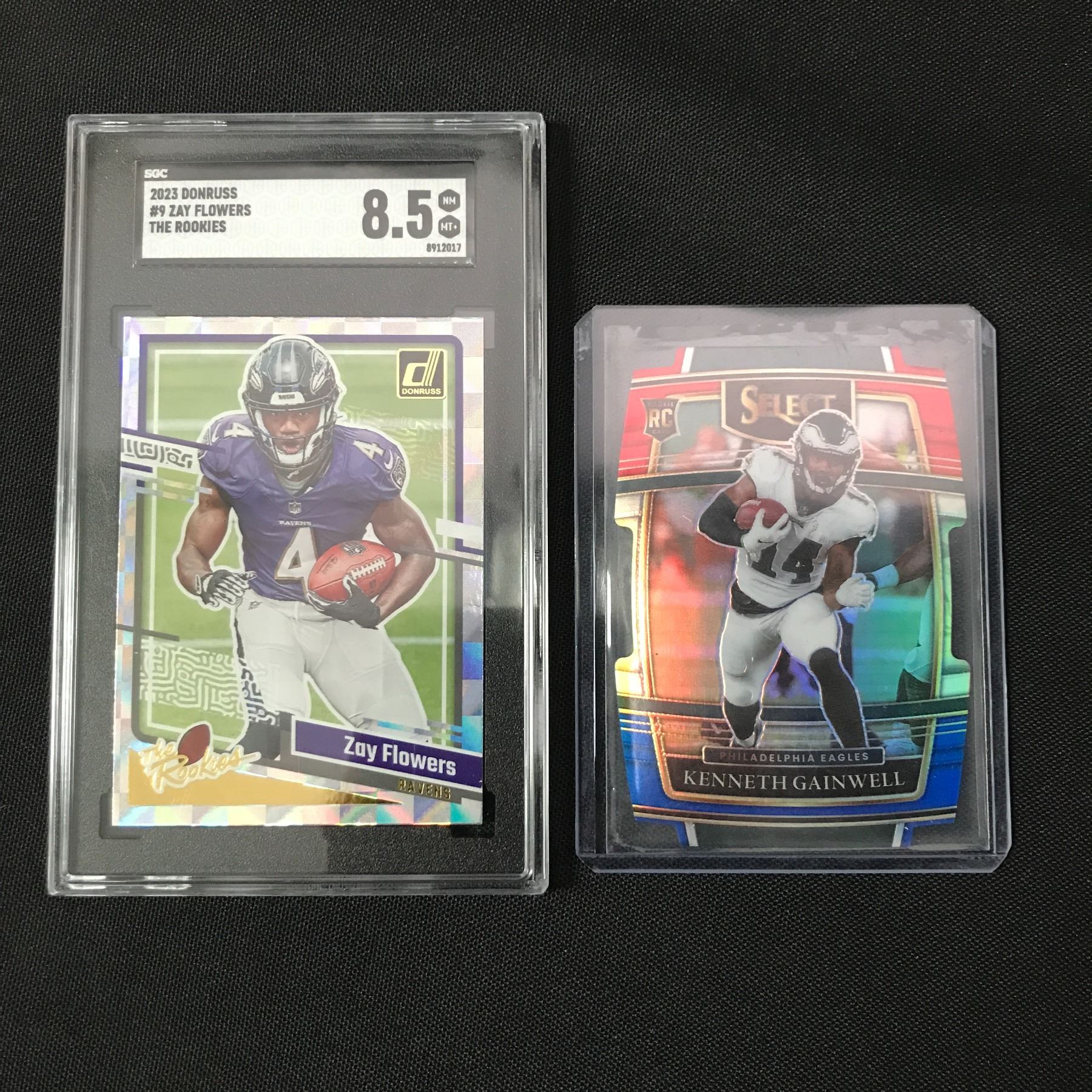 Lot 479 LOT OF 2 FOOTBALL TRADING CARDS - INCLUDING 2023 DONRUSS OPTIC ZAY FLOWERS TRADING CARD - SGC 8.5
