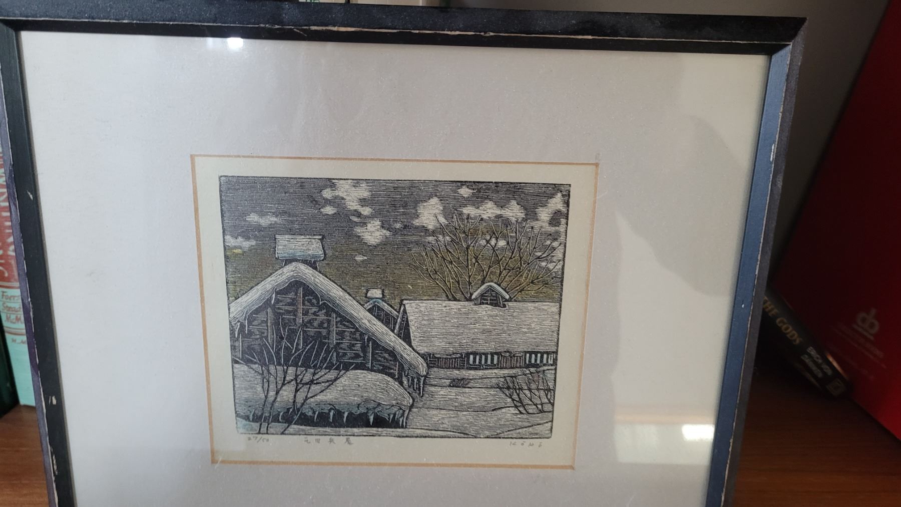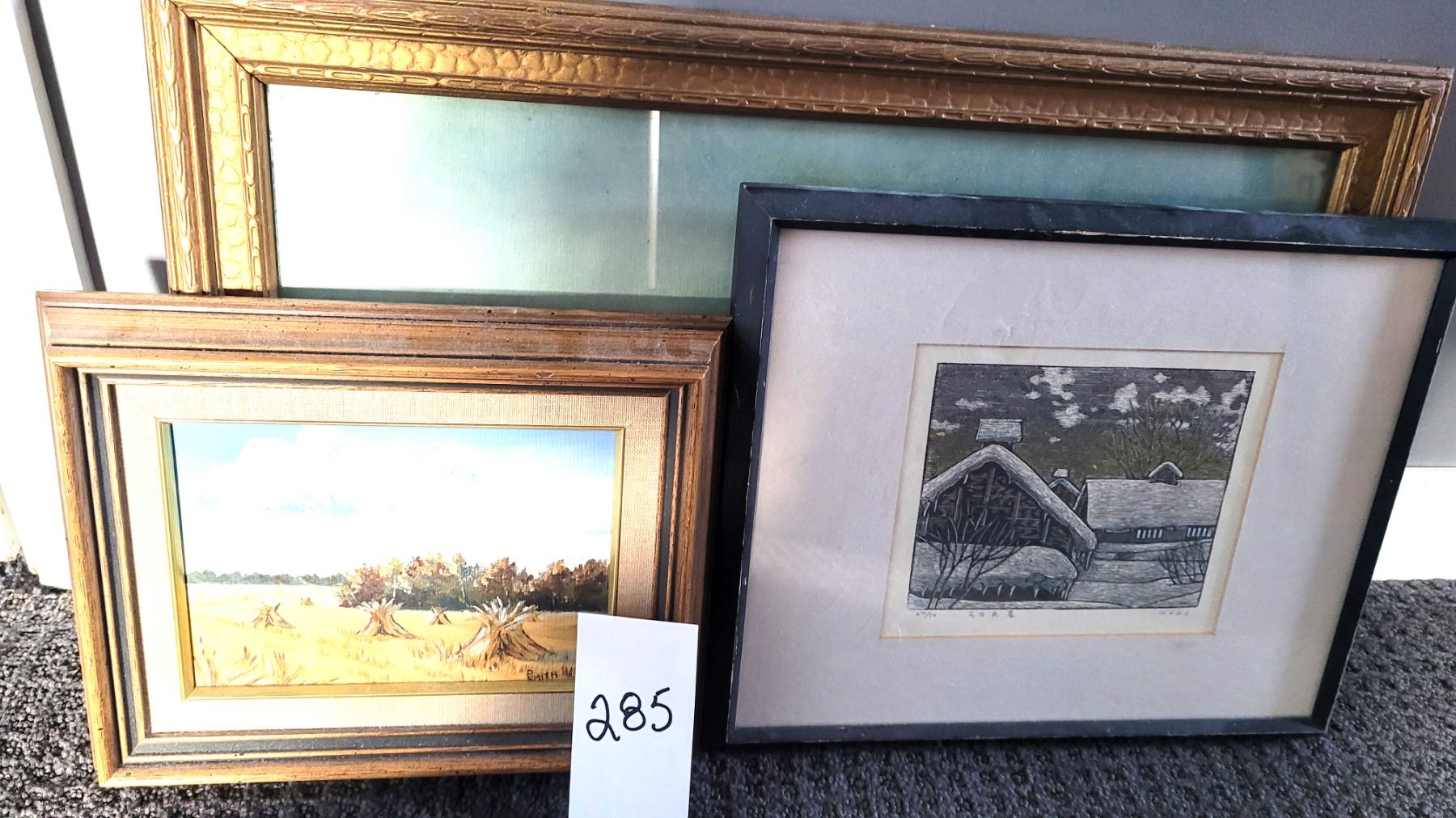 3 pc of framed art one signed by Pat Smith. Pickup at 10 am