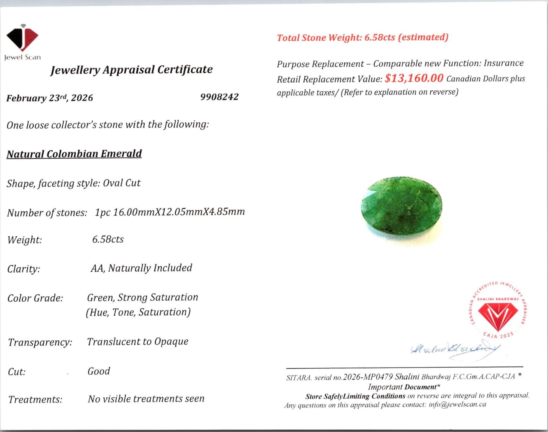 Natural Colombian Emerald. Shape: Oval cut. 1pc - 16.00mmX12.05mmX4.85mm Weight: 6.58cts. Clairty: AA, Naturally Included. Colour Grade: Green, Strong Saturation, (Hue, Tone, Saturation. Transparency: Translucent to Opaque. Cut: Good. No visible treatments seen. Pickup at 9 am