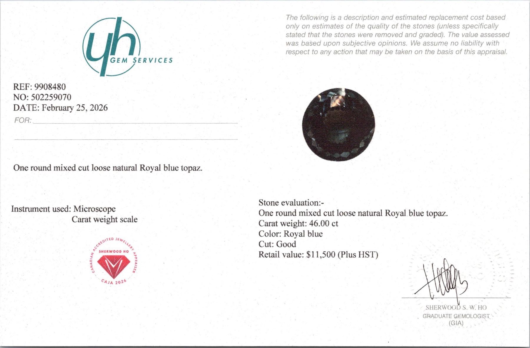Lot 312 46 ct Certified Royal Blue Topaz gemstone ($11,500 Appraisal)