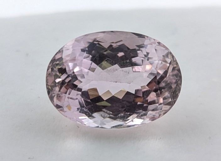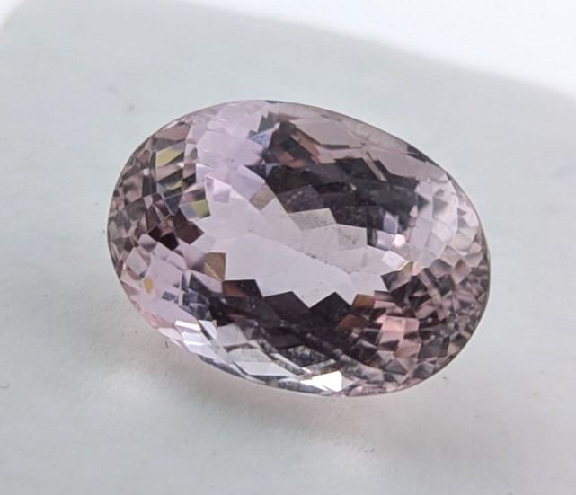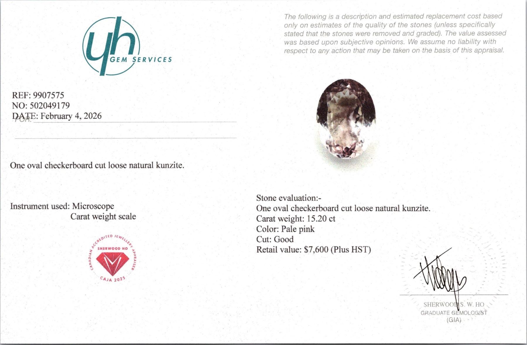 Oval checkerboard cut loose natural kunzite. Carat weight: 15.20ct. Colour: Pale pink. Cut: Good.Pickup at 9 am