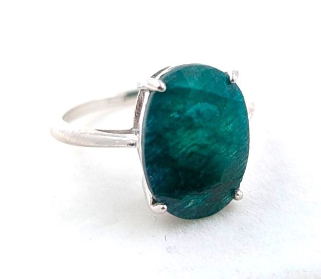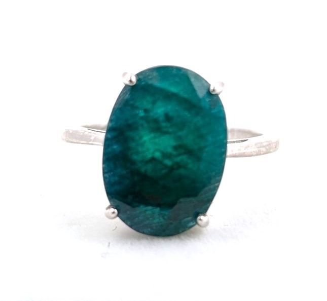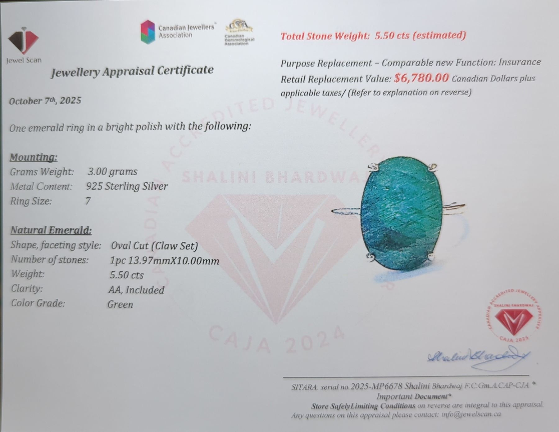 Emerald Ring. Grams weight: 3.00gms. Metal: Sterling Silver. Ring size 7. Shape: Oval cut, (claw set). Weight: 5.50 cts. Number of stones: 1 pc - 13.97mmX10.00mm. Clarity: AA, Included. Colour: Green. Pickup at 9 am