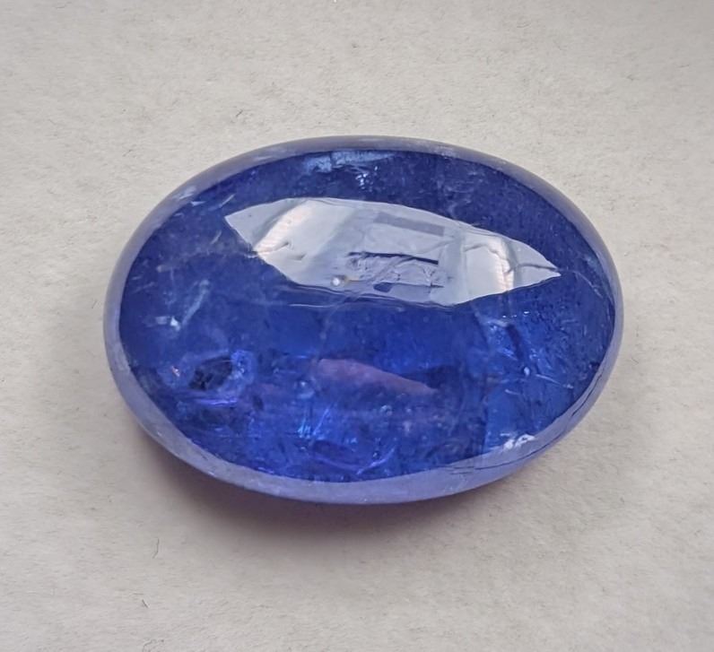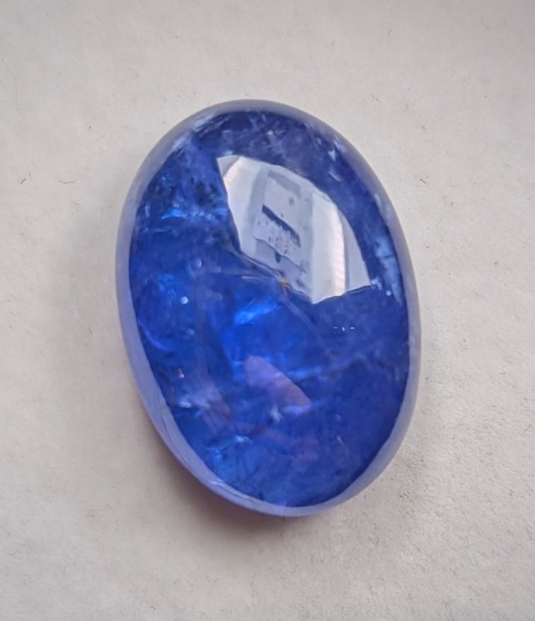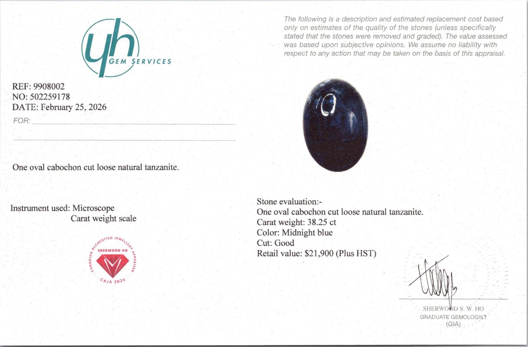 Oval cabochon cut loose natural tanzanite. Carat weight: 38.25 ct. Colour: Midnight blue. Cut: Good. Pickup at 9 am