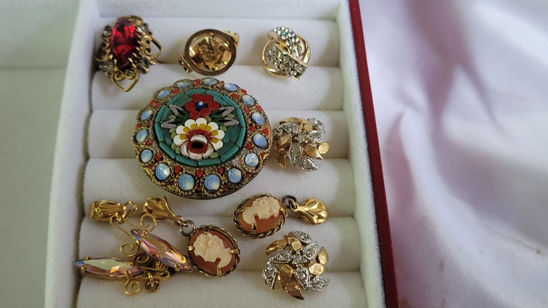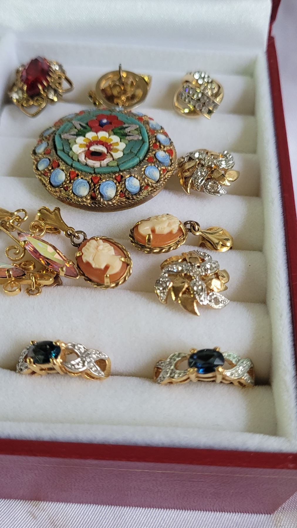 Locket, stick pins, cameos earrings, mosaic. Pickup at 9 am