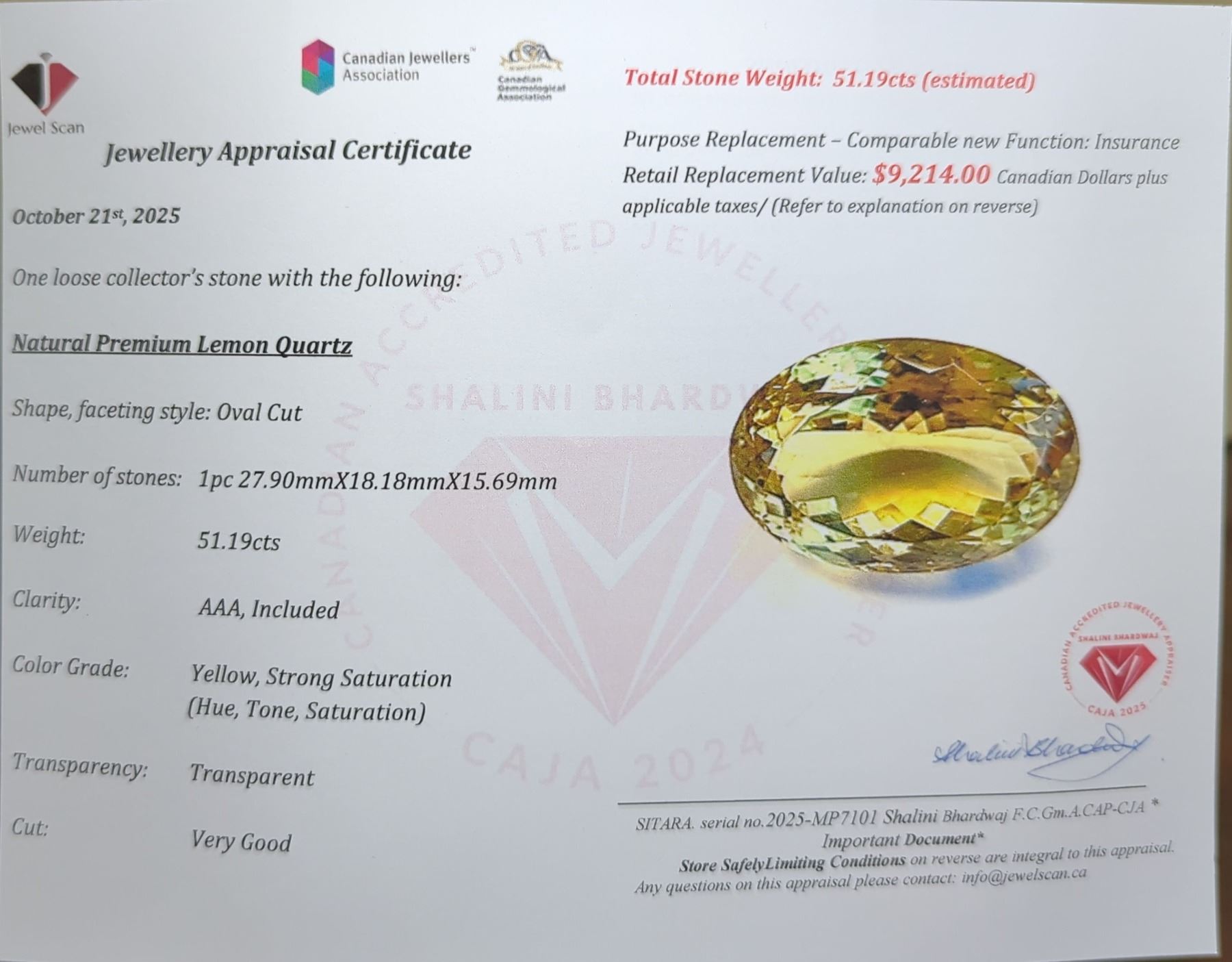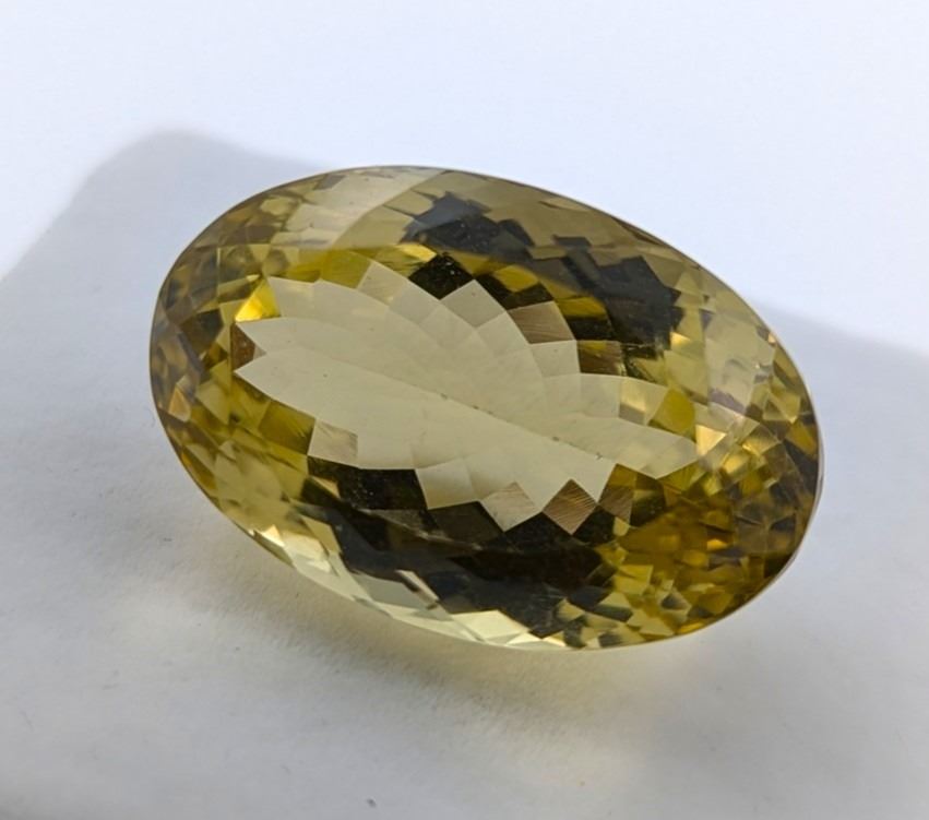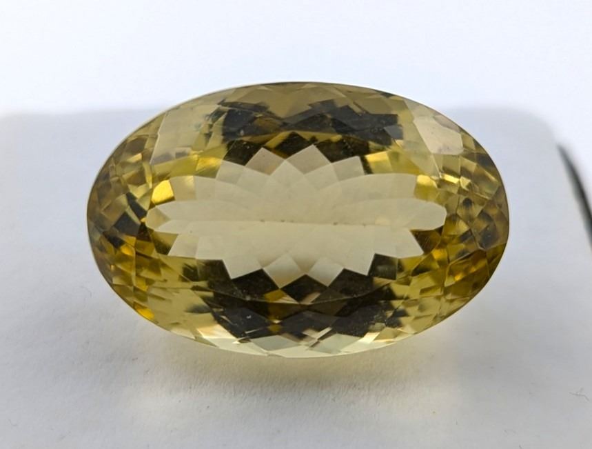 Naturaral Premium Lemon Quartz. Shape: Oval cut. Number of stones: 1 pc- 27.90mmX18.18mmX15.69mm. Weight 51.19 ct. Clarity: AA, Included. Colour: Yellow, strong saturatin, (Hue,tone, saturation). Transparency: Transparant. Cut: Very Good. Pickup at 9 am