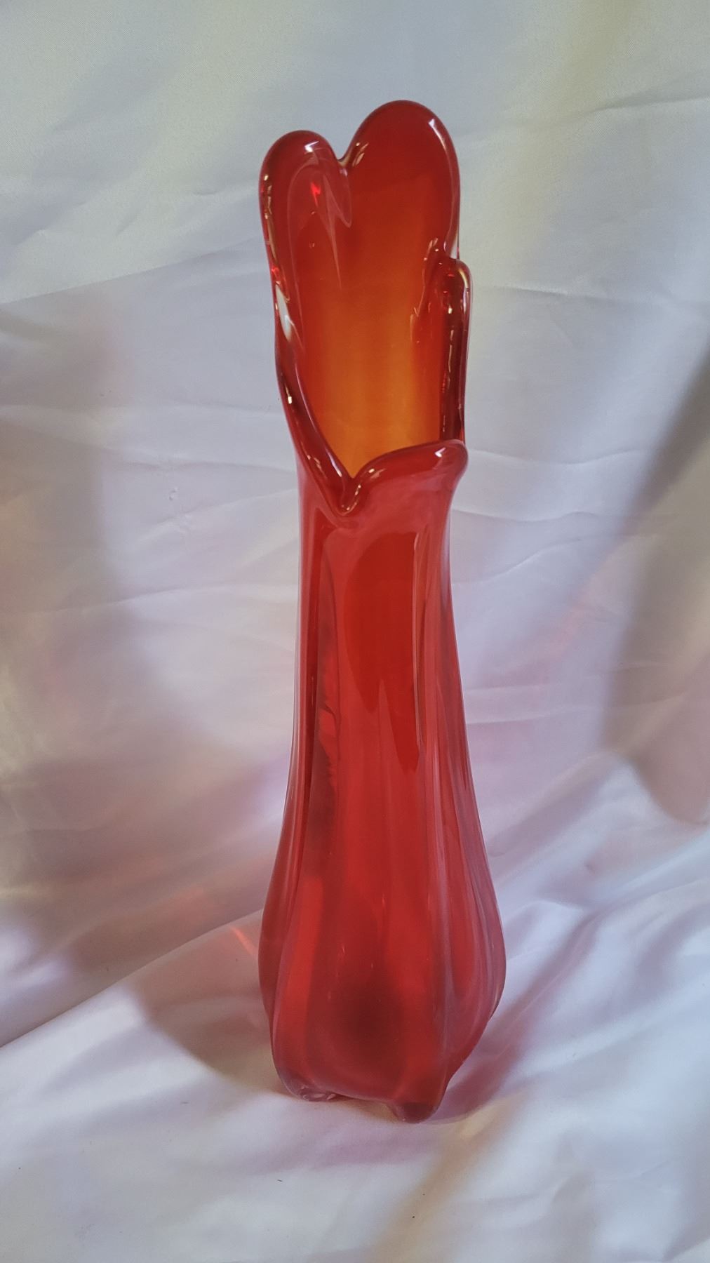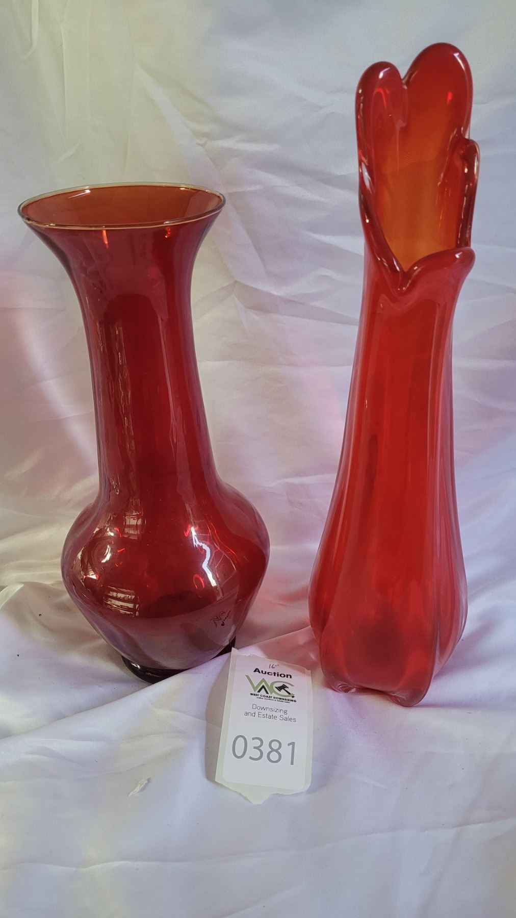 Pair of vintage red glass vases, tallest is 16" Pickup at 9 am