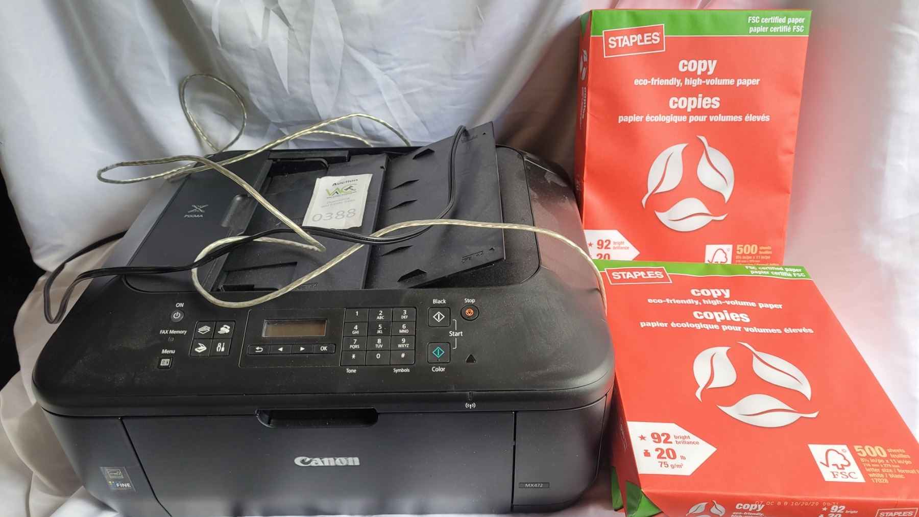 Canon MX472 Printer. 3 x 20Lb weigh white copy paper, each package has 500 sheets. Pickup at 10 am