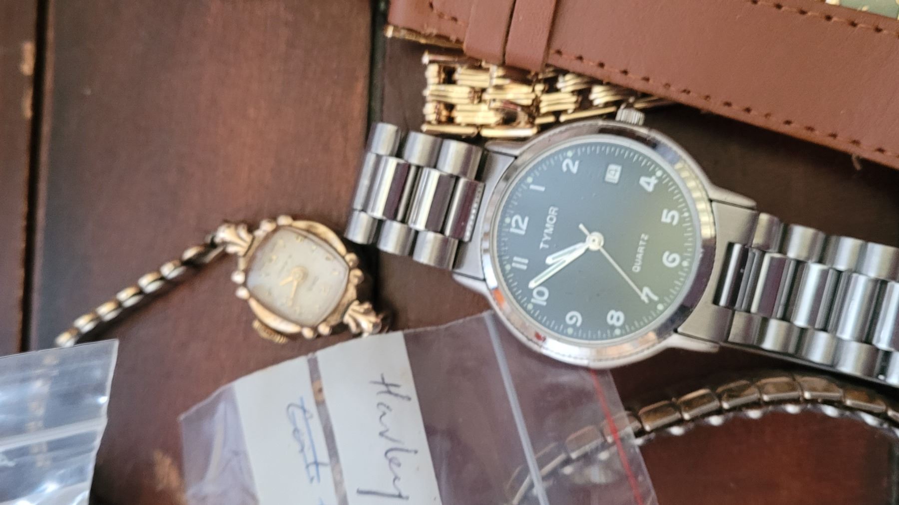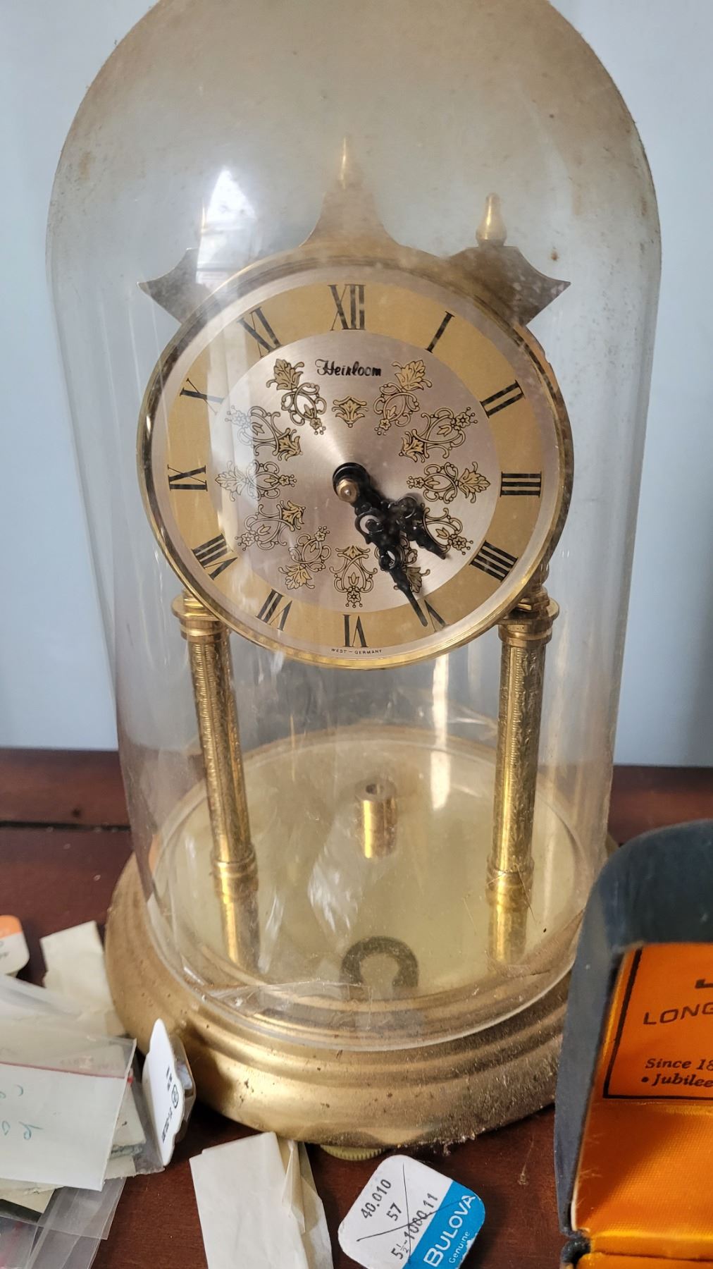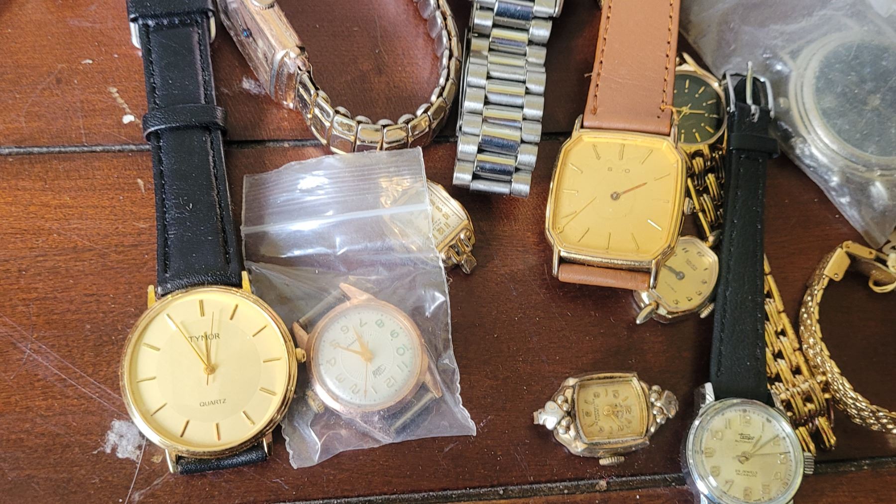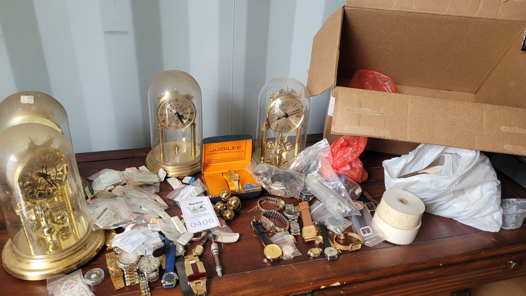 Assortment of wrist watches, and domed clocks sent in for repair, all untested. Pickup at 10 am