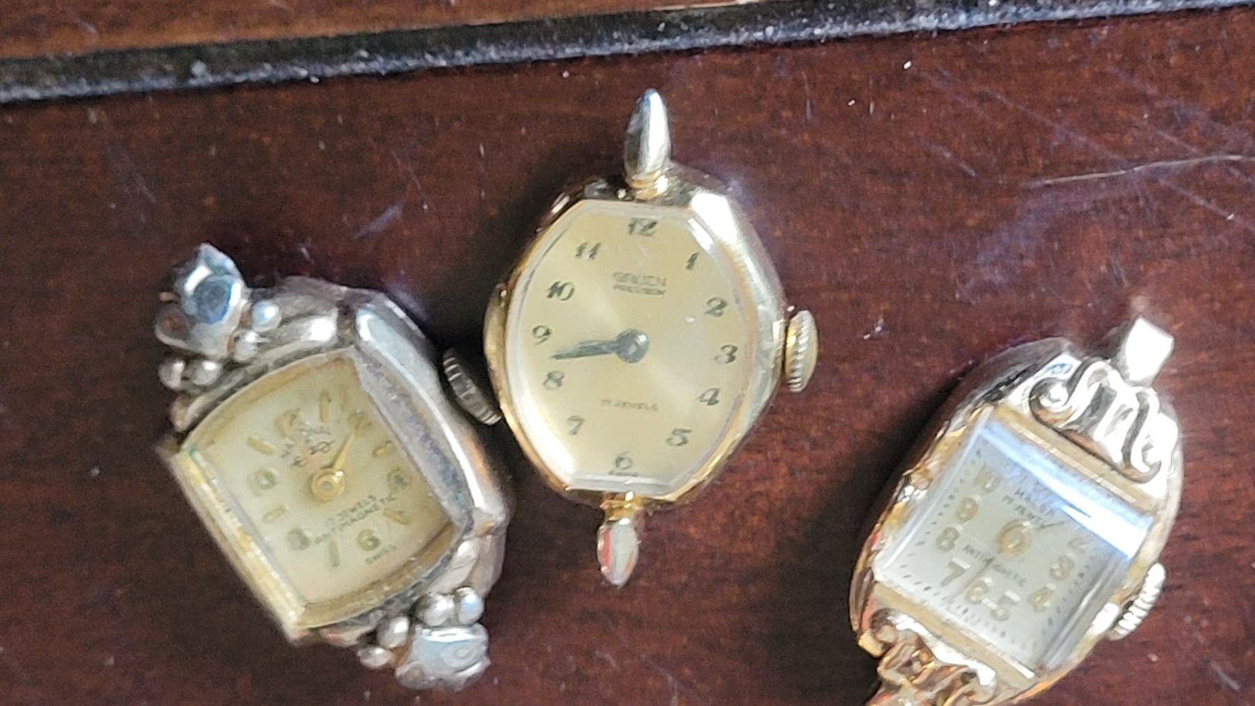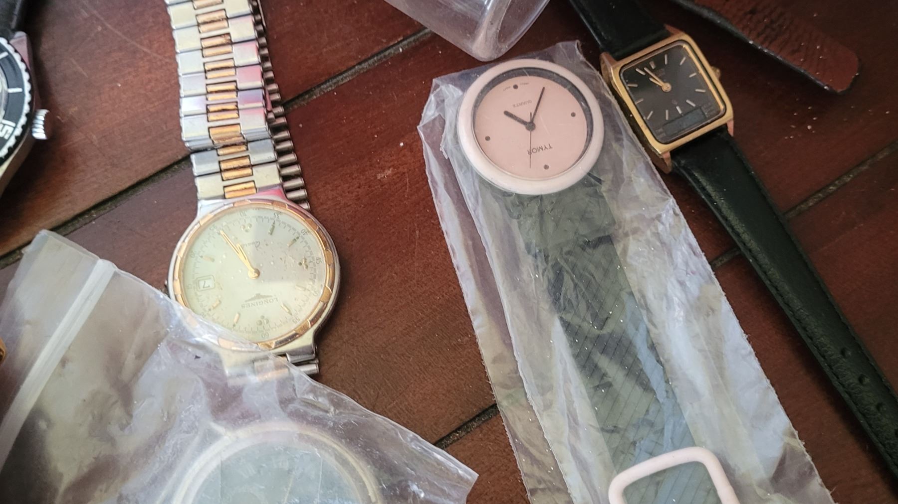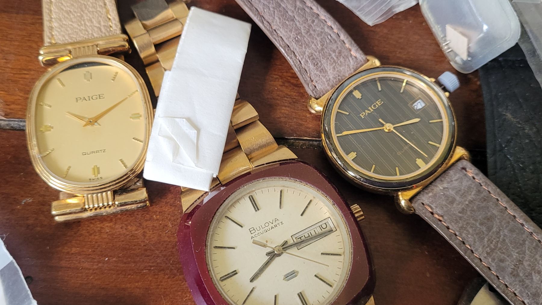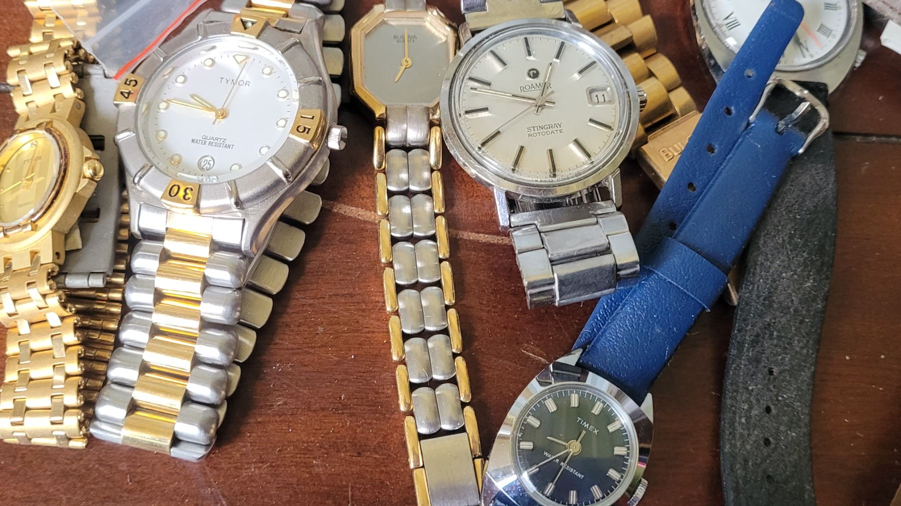 Assortment of wrist watches, and domed clocks sent in for repair, all untested. Pickup at 10 am