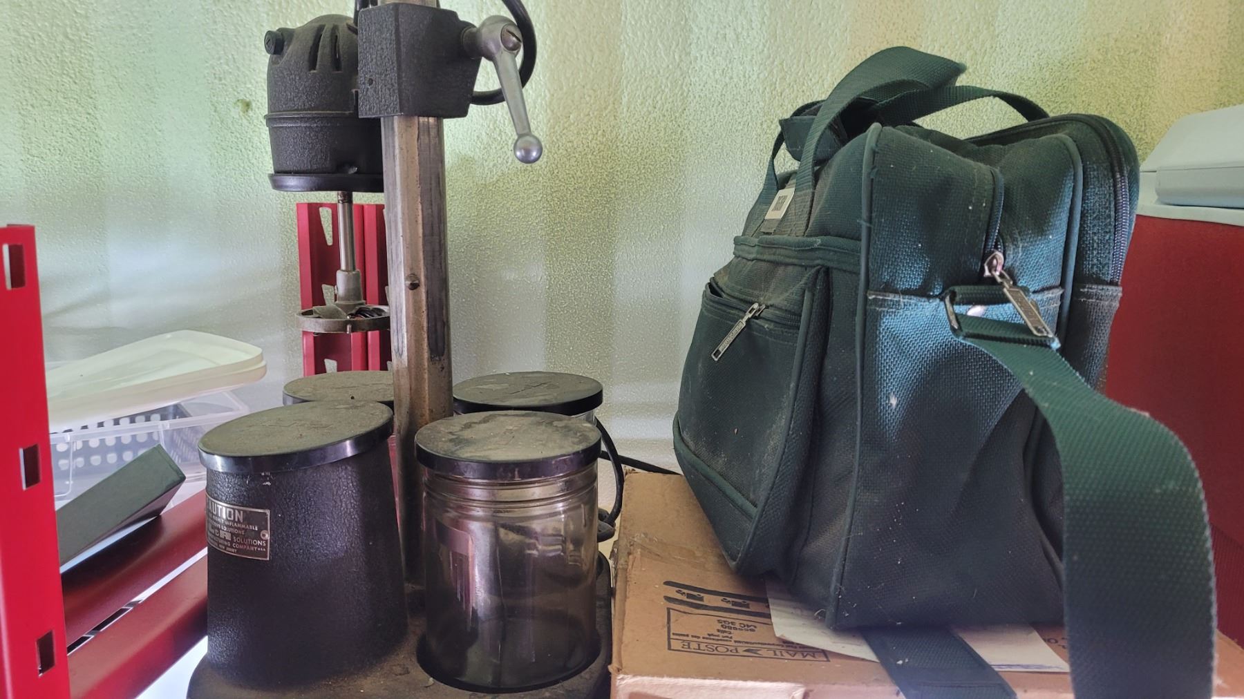 Vintage watch cleaning machine with glass canister and a bag of glass canisters with cleaning fluid. Pickup at 10 am