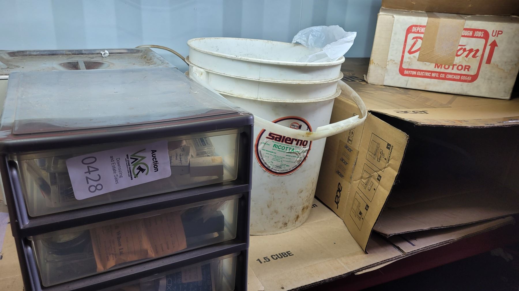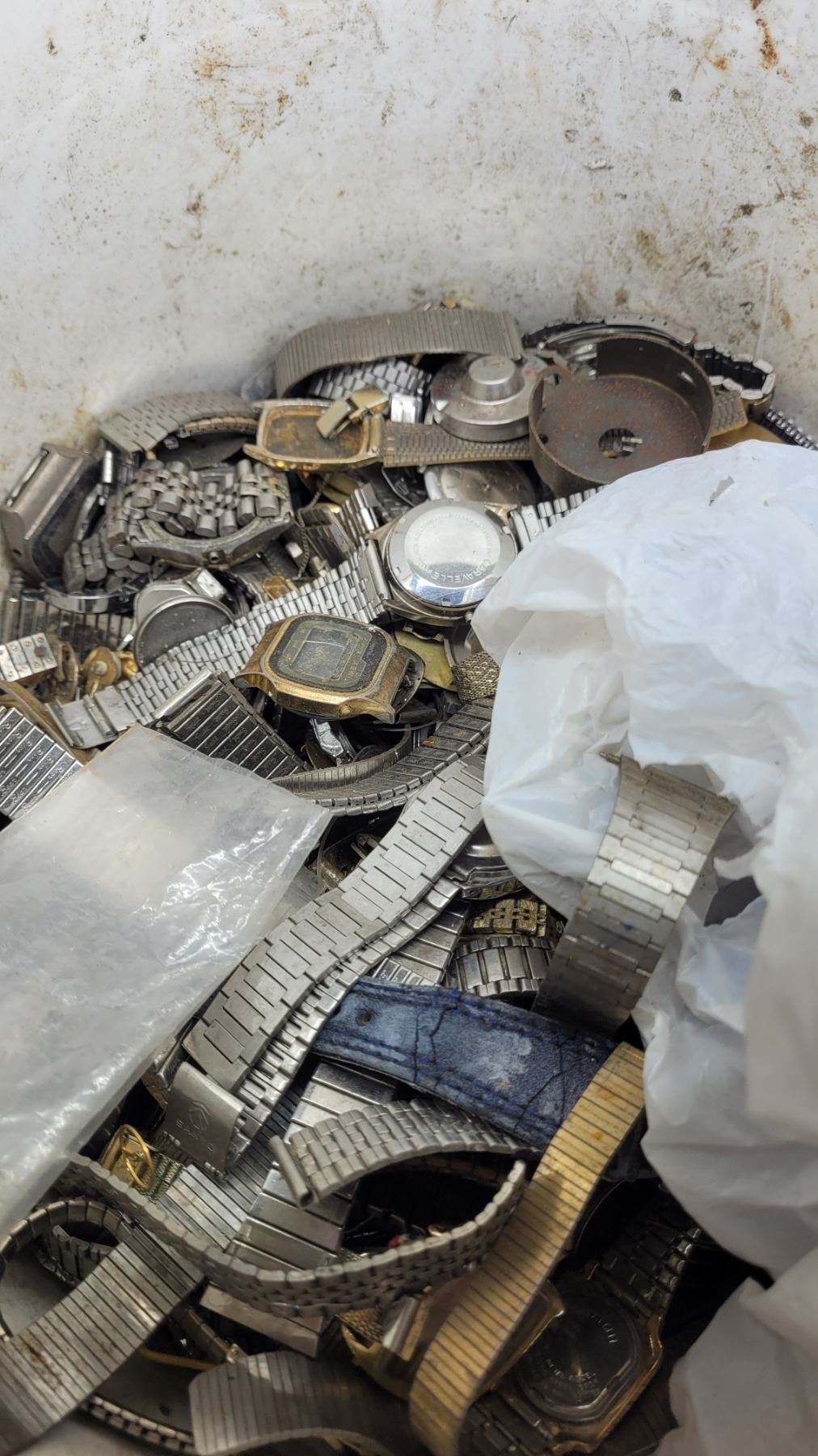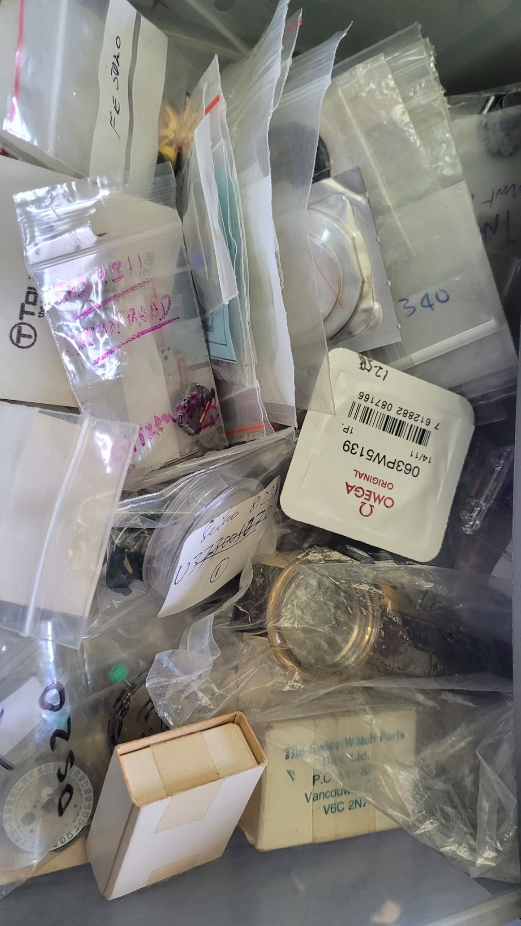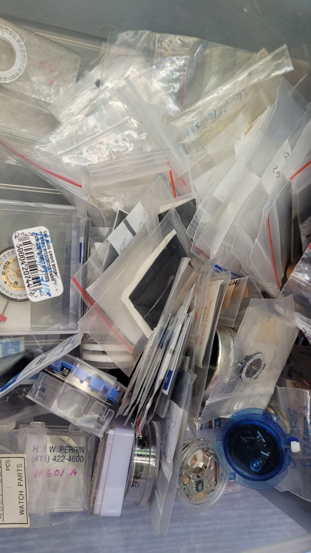 Large assortment of clock and watch repair parts, bucket full of watches for parts, cleaning machine and motors. Pickup at 10 am