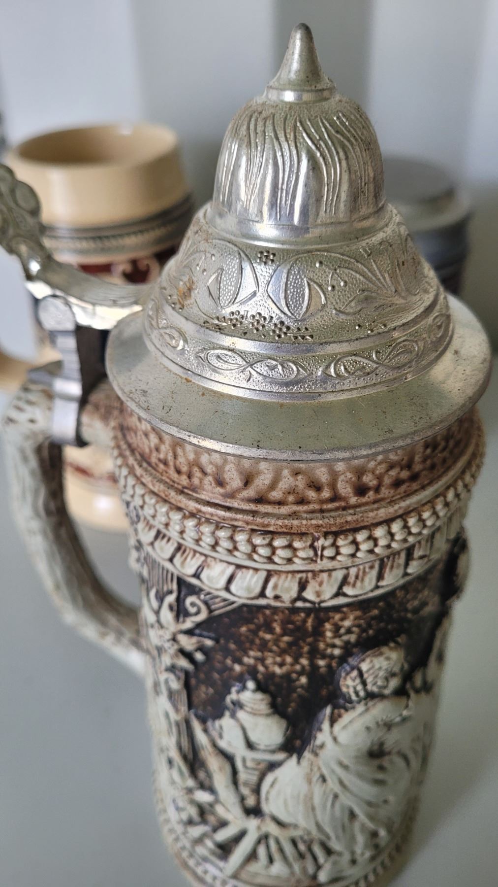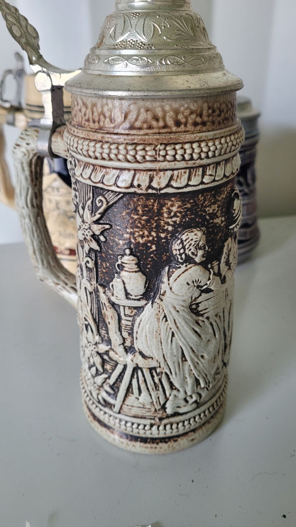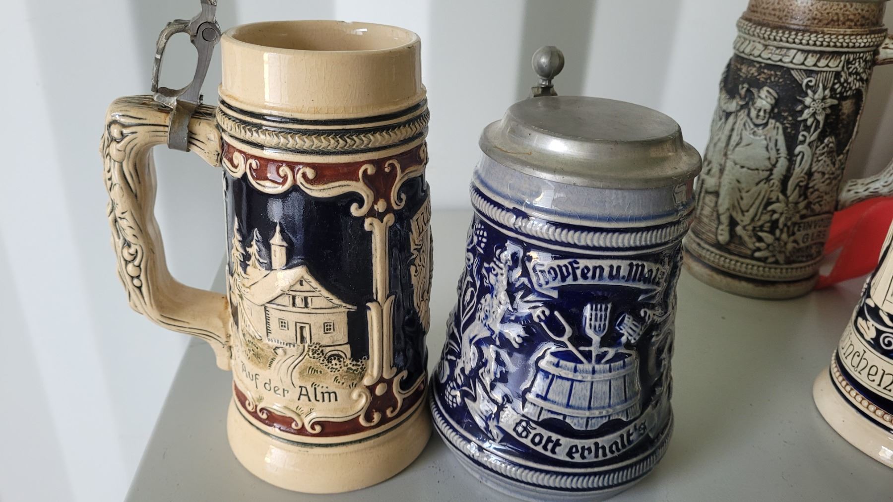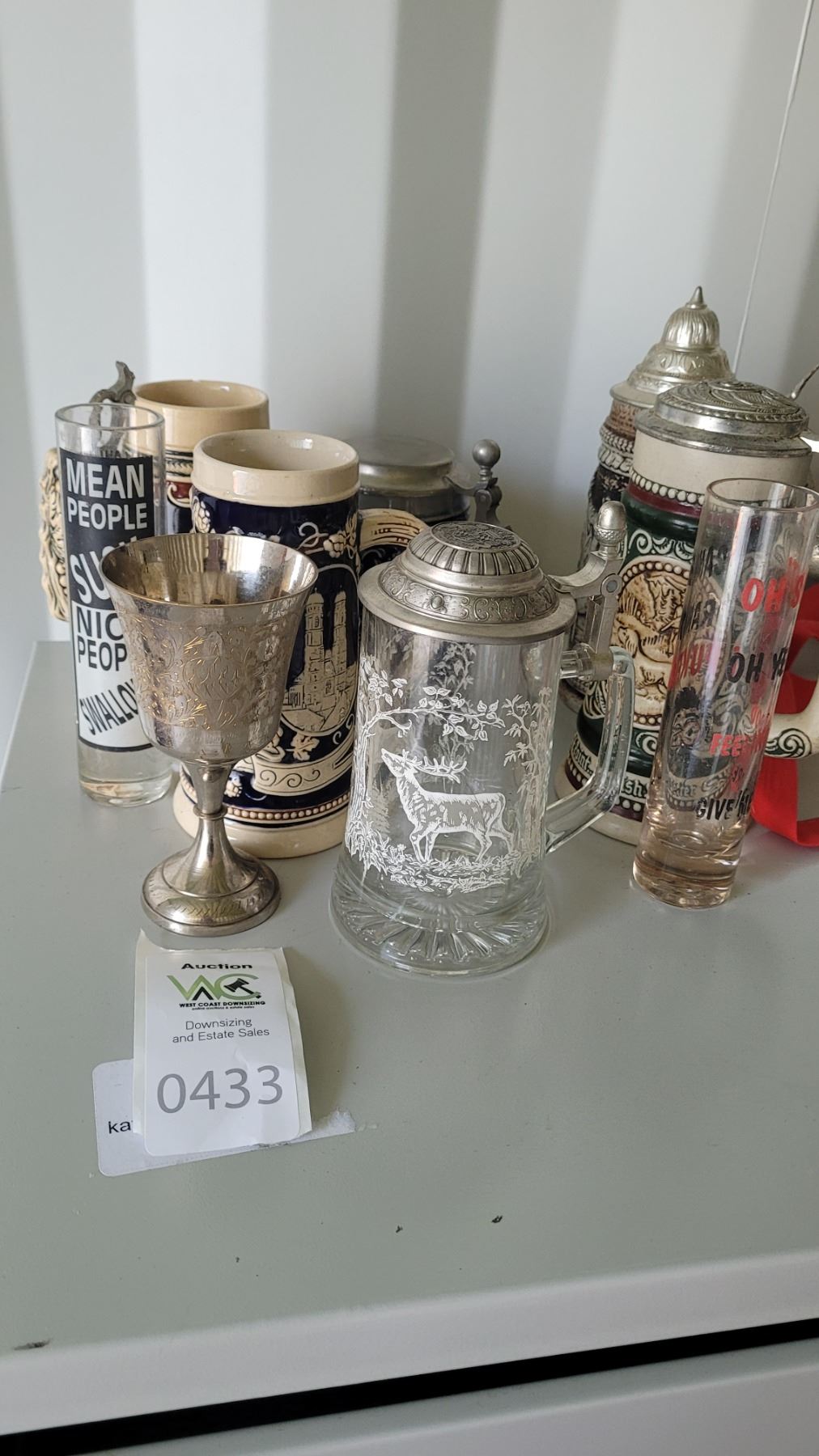 Assortment of Beer Steins ceramic and glass beersteins with pewter caps. Silver plated goblet from India. Pickup at 10 am
