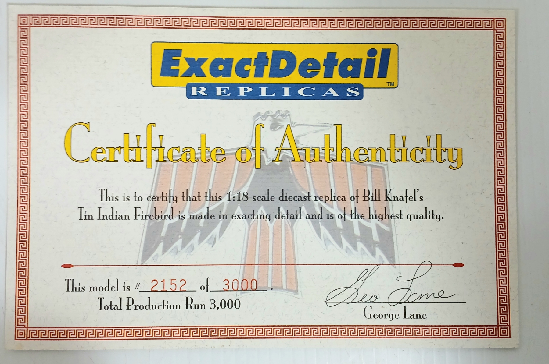 Lot 1303 EXACTDETAL REPLICAS DIECAST TIN INDIAN PONTIAC FIREBIRD 400 MODEL - BILL NAFEL PONTIAC