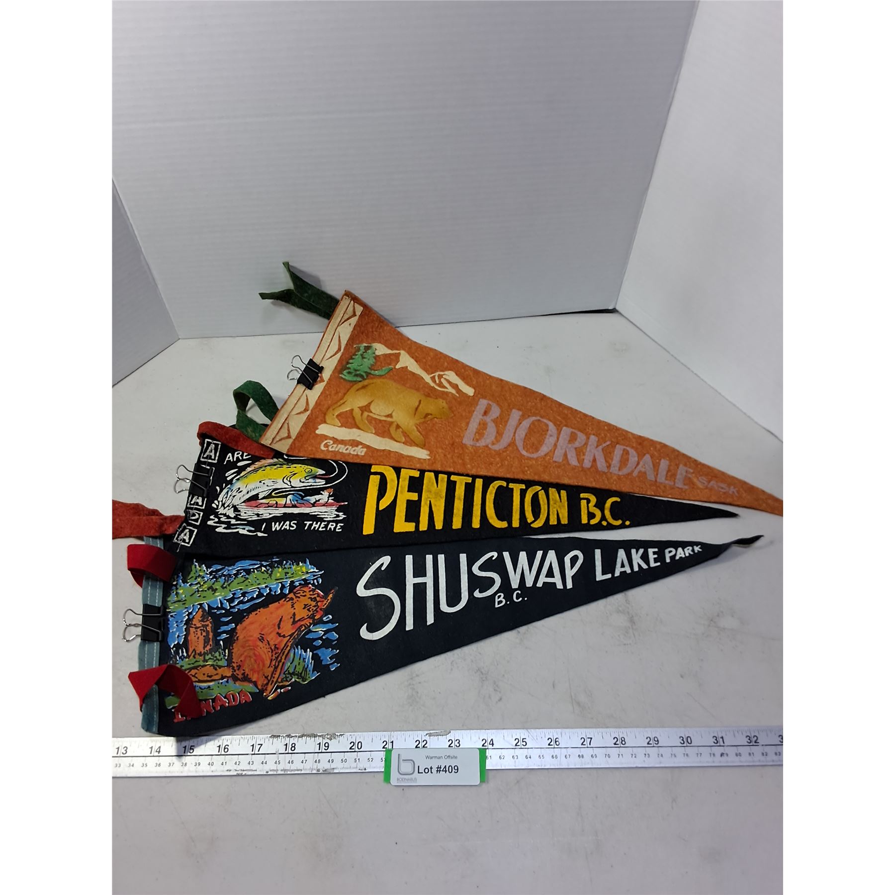 Lot 409 (3) Vintage Felt Pennants w/Clips