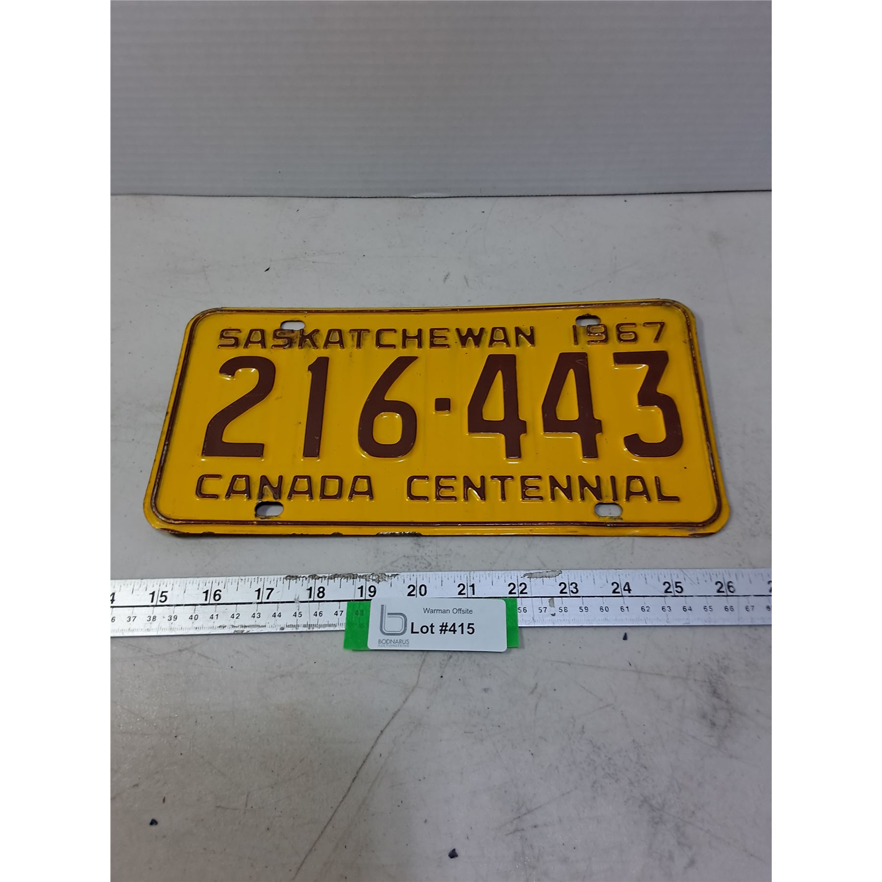 Lot 415 1967 Saskatchewan Centennial License Plate