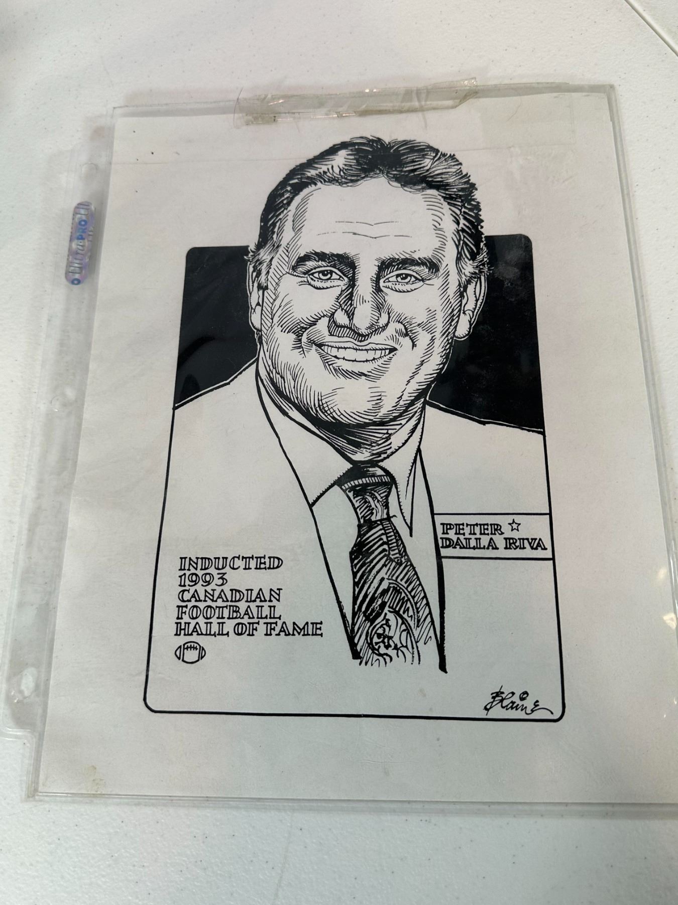 Unique 1993 Canadian Football Hall of Fame commemorative trophy honoring Peter Dalla Riva of the Montreal Alouettes. Includes engraved plaque and accompanying display plaque, marking his Hall of Fame induction. A rare one-of-a-kind piece of CFL history, ideal for serious collectors of Canadian football memorabilia.