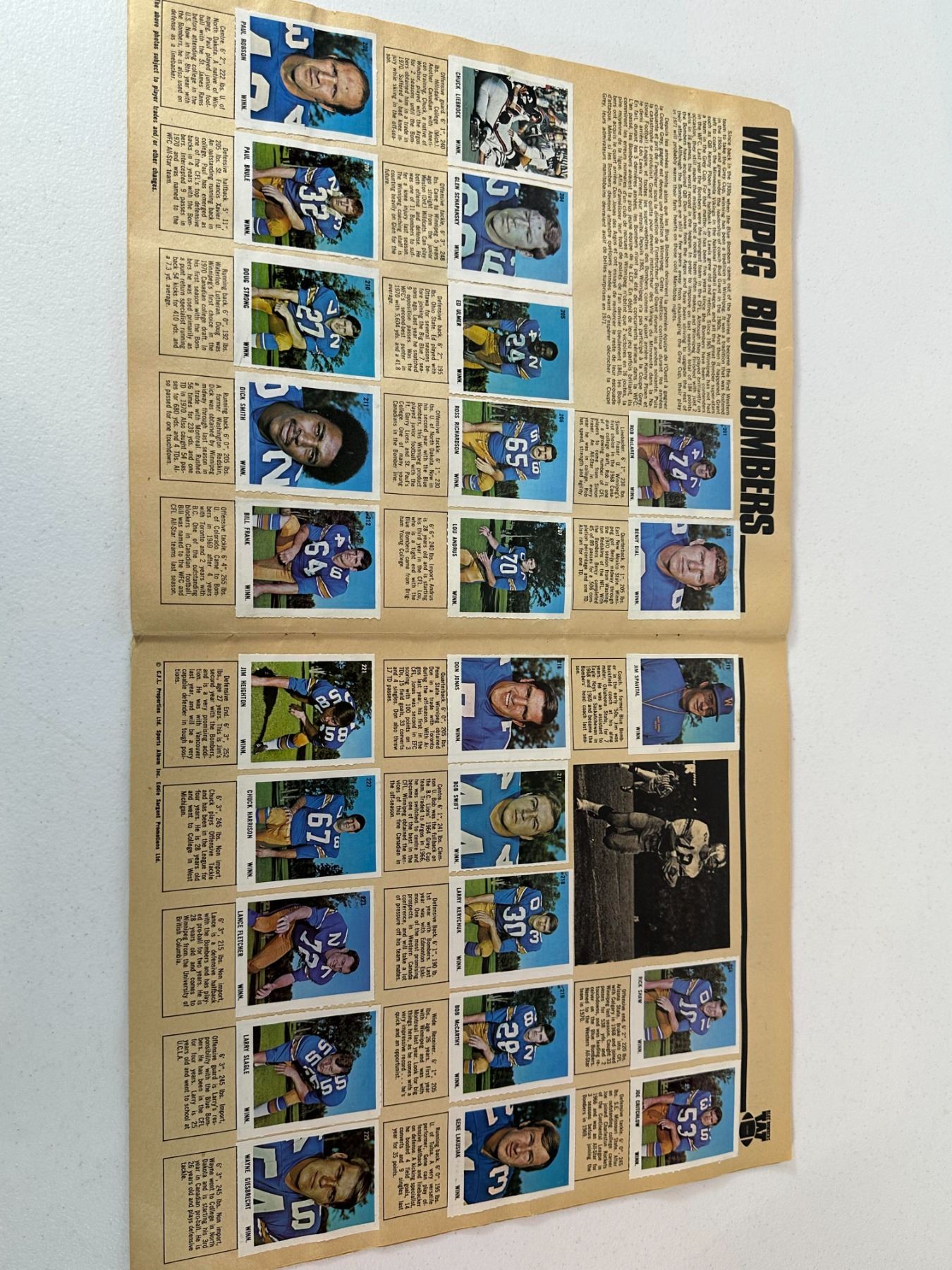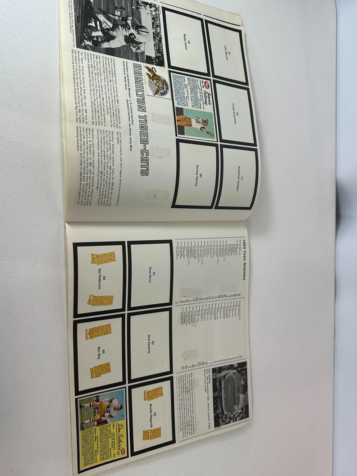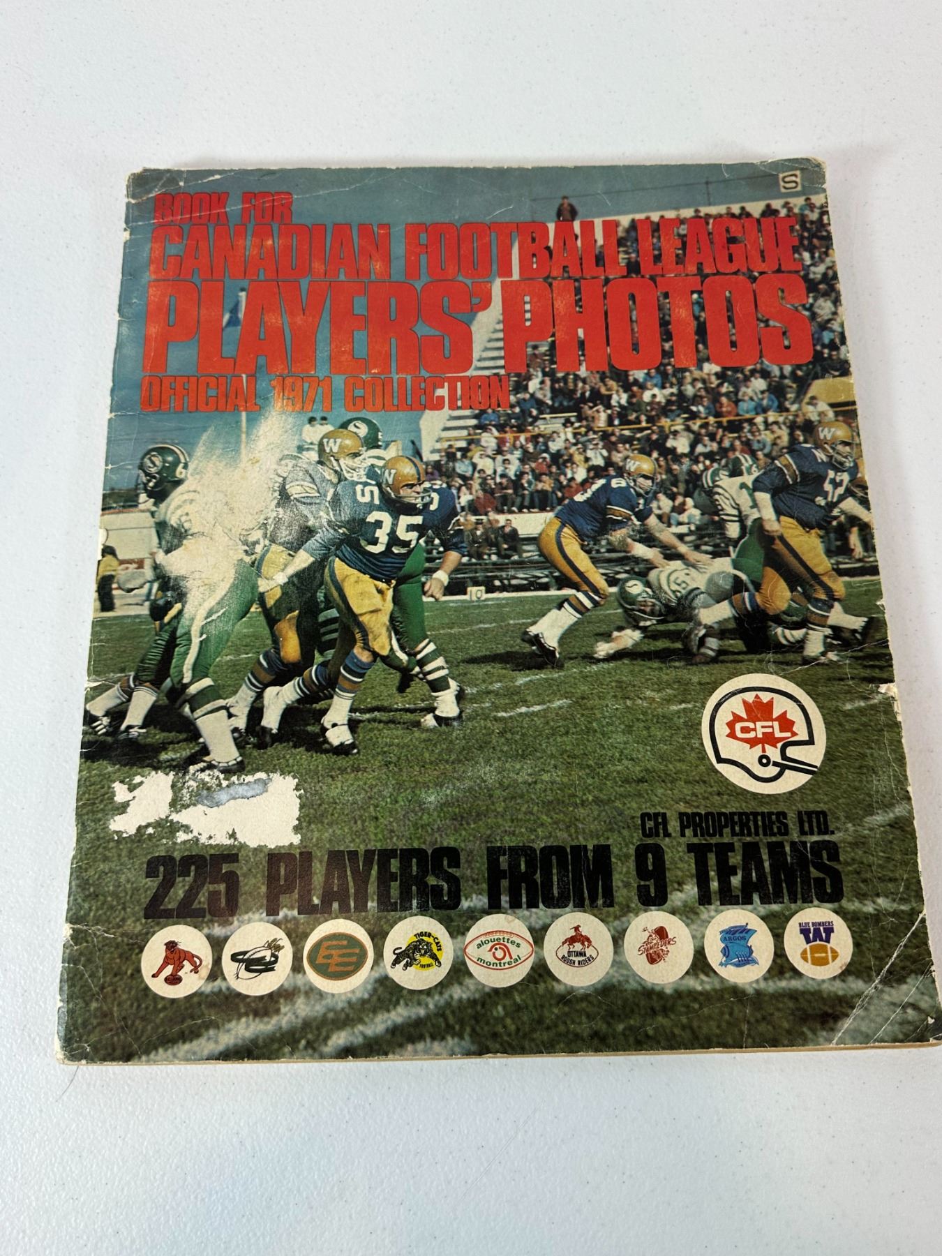 1971 Canadian Football League (CFL) complete sticker/photo set accompanied by original album. Features players from multiple teams and includes a full collection as indicated. Vintage condition with visible wear to album cover, adding to its authenticity as a classic sports collectible.