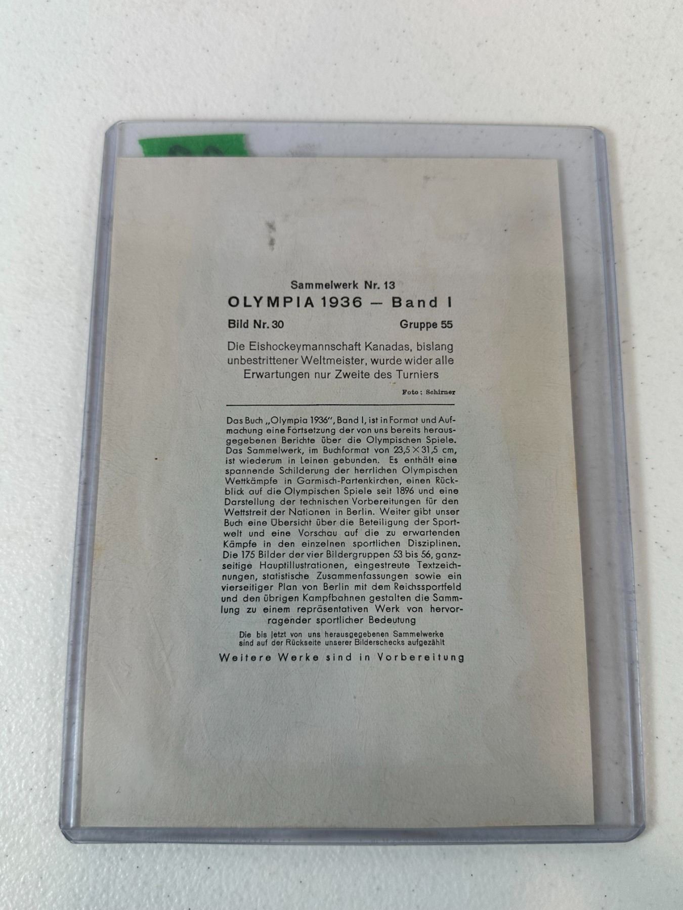 Vintage 1936 Olympic hockey photo card featuring Team Canada from the Winter Olympics. Black-and-white image with German text on reverse referencing Olympia 1936 (Band I). Historical collectible tied to early international hockey competition and Olympic history.