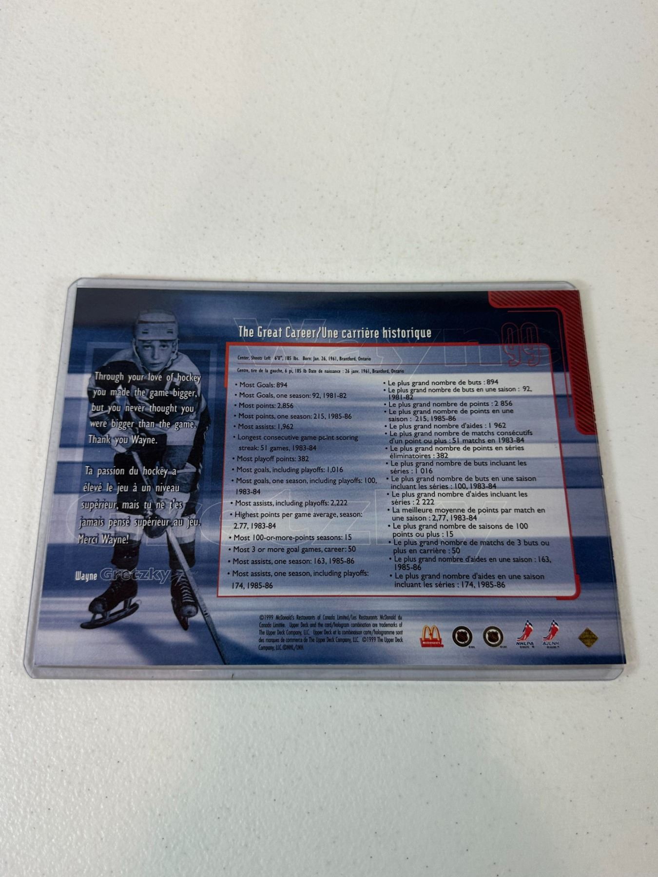 Oversized 1999 Upper Deck McDonald's promotional Wayne Gretzky card. Features Gretzky across multiple teams (Oilers, Kings, Blues, Rangers) with 'The Great One' design. Mail-in exclusive collectible highlighting his career.