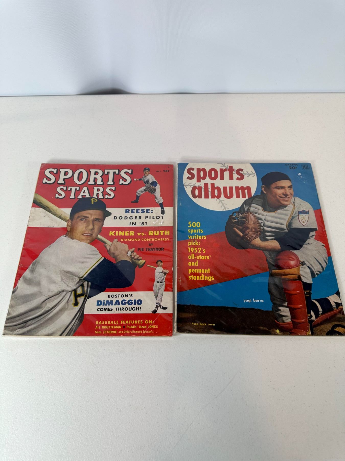 Lot of 2 vintage 1950s baseball magazines including 'Sports Stars' featuring Joe DiMaggio and 'Sports Album' featuring Yogi Berra. Classic mid-century baseball publications with period graphics and articles.