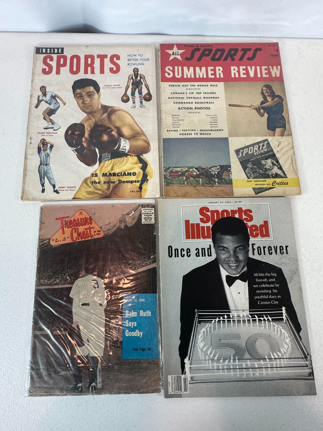 Collection of vintage sports magazines including a Sports Illustrated issue featuring Muhammad Ali ('Once and Forever' 50th birthday cover), along with Inside Sports, Street & Smith’s All Sports Summer Review (1950), and Treasure Chest featuring Babe Ruth. Mixed eras and sports coverage including boxing, baseball, and general athletics. A diverse lot with strong nostalgic and collector appeal.