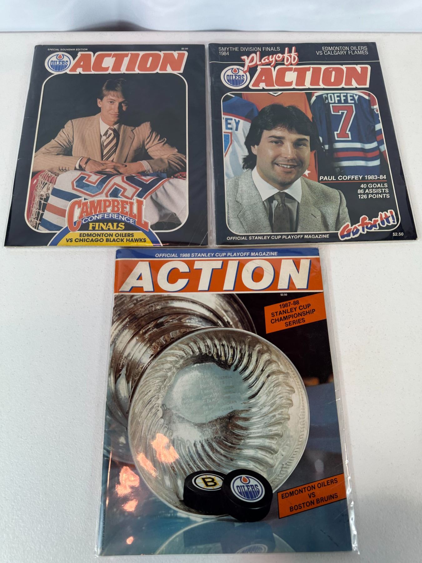 Group of three Edmonton Oilers playoff programs including Campbell Conference Finals vs Chicago Blackhawks, 1984 Smythe Division Finals vs Calgary Flames (featuring Paul Coffey), and 1988 Stanley Cup Championship Series vs Boston Bruins. Represents the Oilers dynasty era led by Wayne Gretzky. Great collectible lot for hockey fans and Oilers memorabilia collectors.