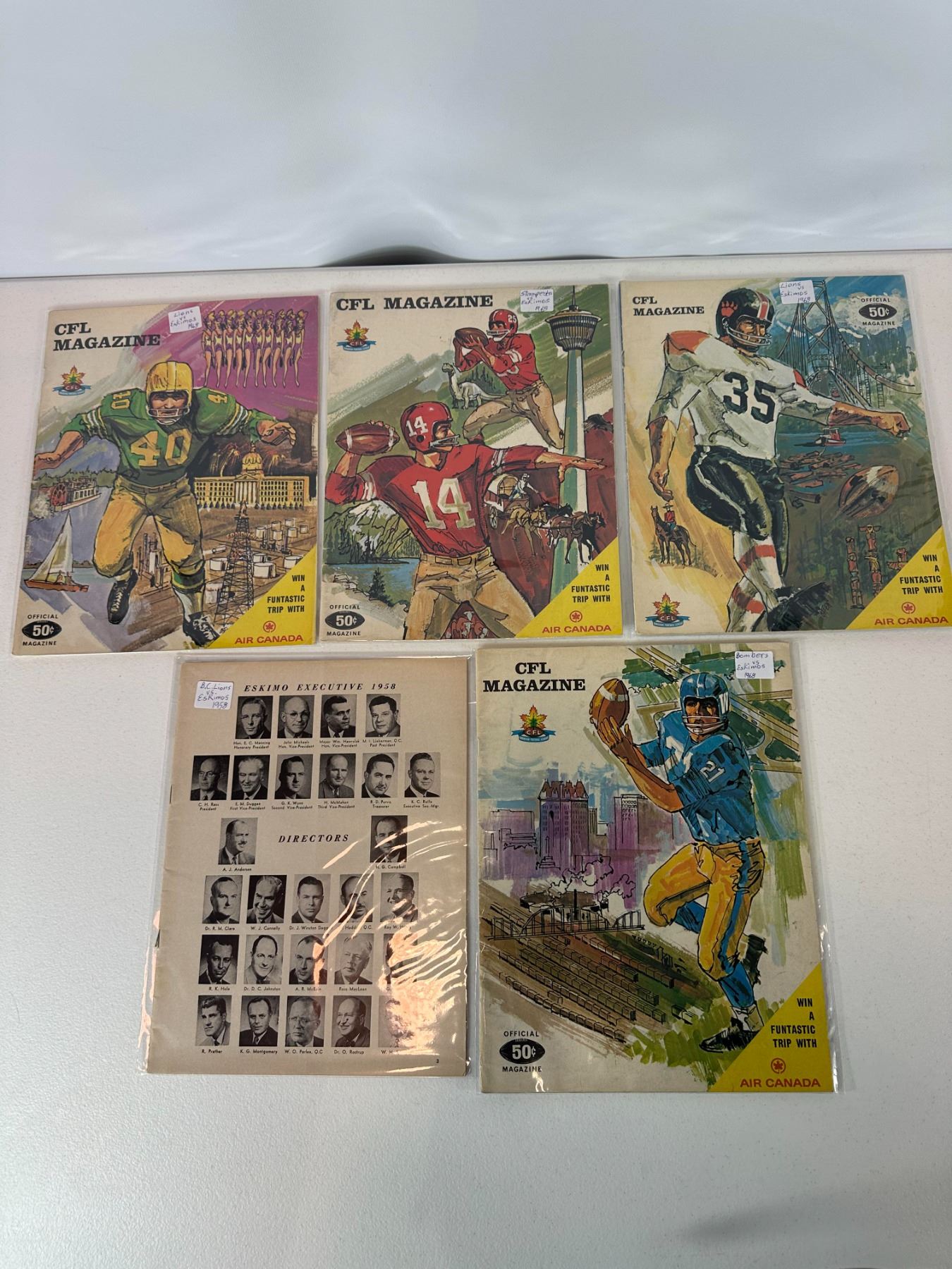 Collection of five vintage 1960s CFL programs featuring the Edmonton Eskimos, including multiple illustrated covers and period photography. Includes team and league content, executive pages, and classic mid-century artwork. A desirable grouping for CFL collectors and fans of Canadian football history.