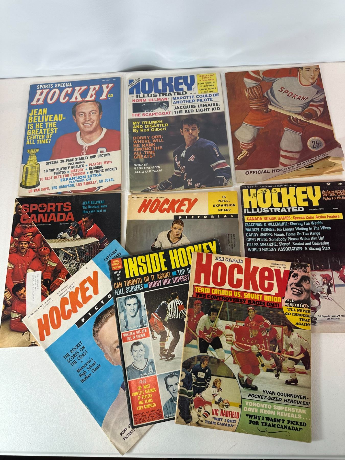 Collection of eight vintage NHL hockey magazines spanning the 1950s to 1970s. Includes titles such as Hockey Illustrated, Sports Canada, Hockey Pictorial, and others featuring stars like Jean Béliveau, Bobby Orr, and Paul Henderson. Covers Stanley Cup content, international play, and classic era storylines. A strong vintage lot for hockey memorabilia collectors.