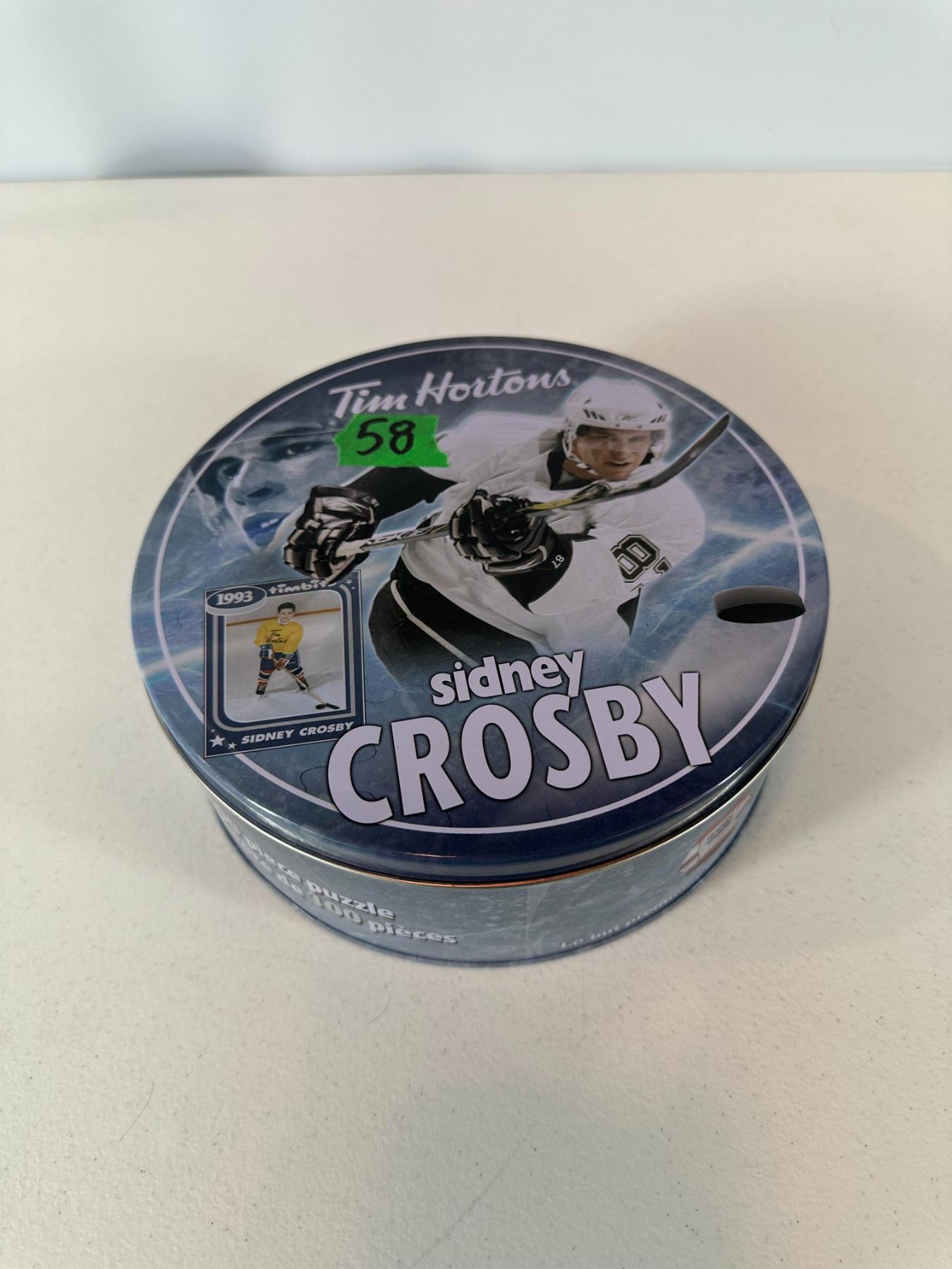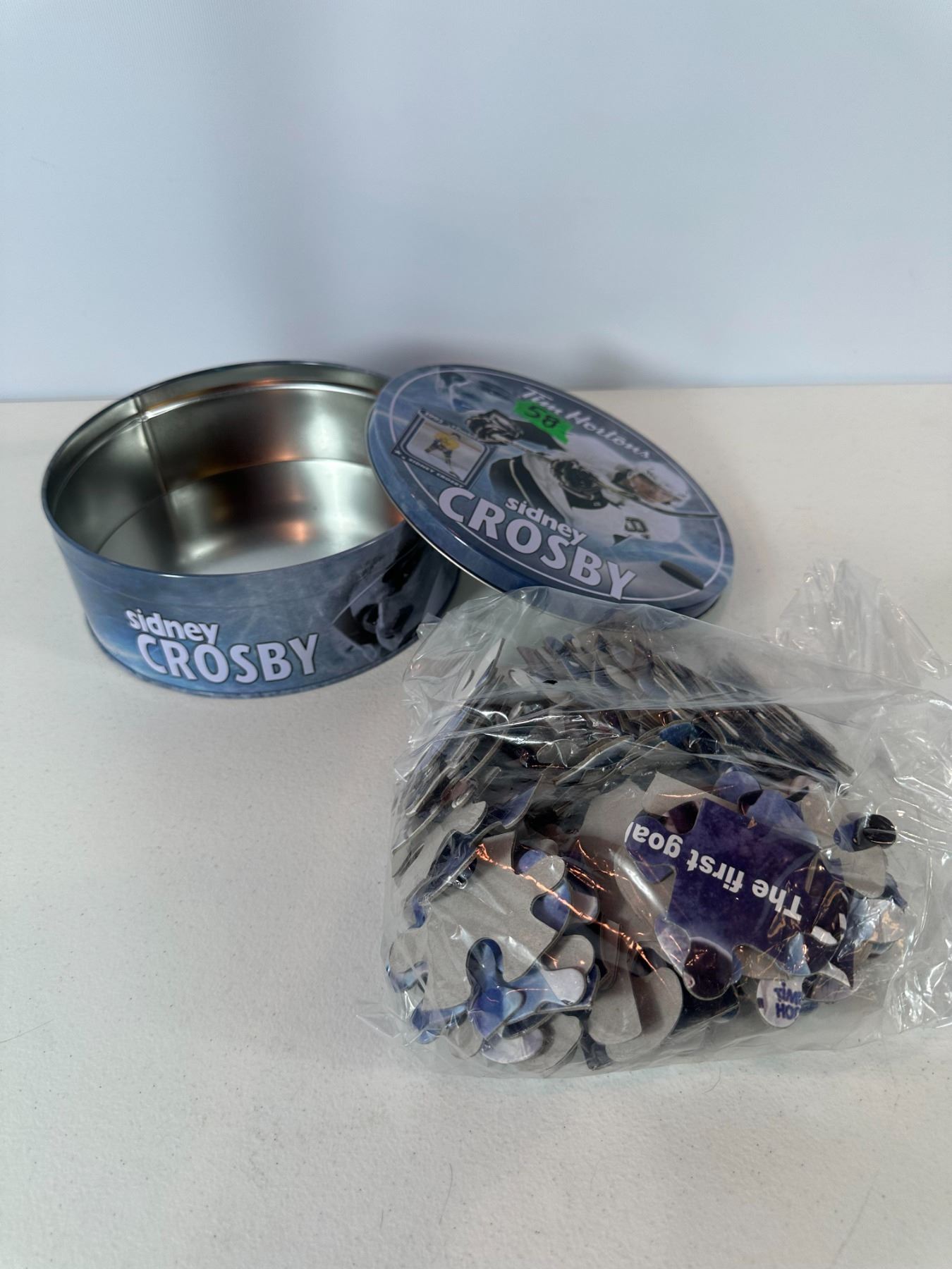 2009 Tim Hortons Sidney Crosby collectible puzzle set, housed in original tin. Includes puzzle pieces still sealed in bag, indicating new old stock (NOS) condition. Features Crosby graphics and Penguins branding. A great collectible for hockey fans and Sidney Crosby enthusiasts.