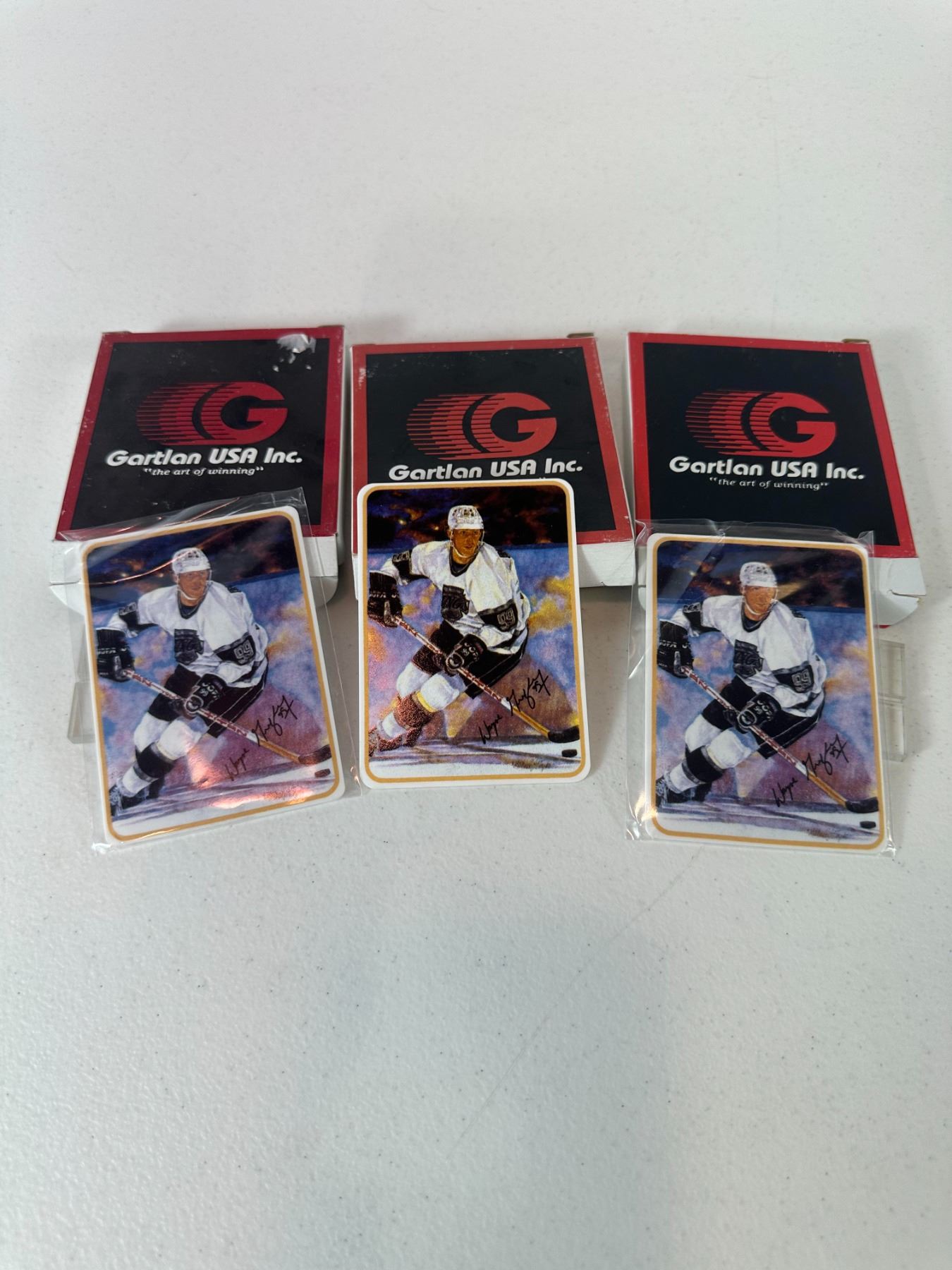 Lot of three Wayne Gretzky ceramic hockey cards by Gartlan USA Inc. Limited-edition style collectibles featuring Gretzky in Los Angeles Kings uniform. Includes original boxes. Unique sports memorabilia pieces.