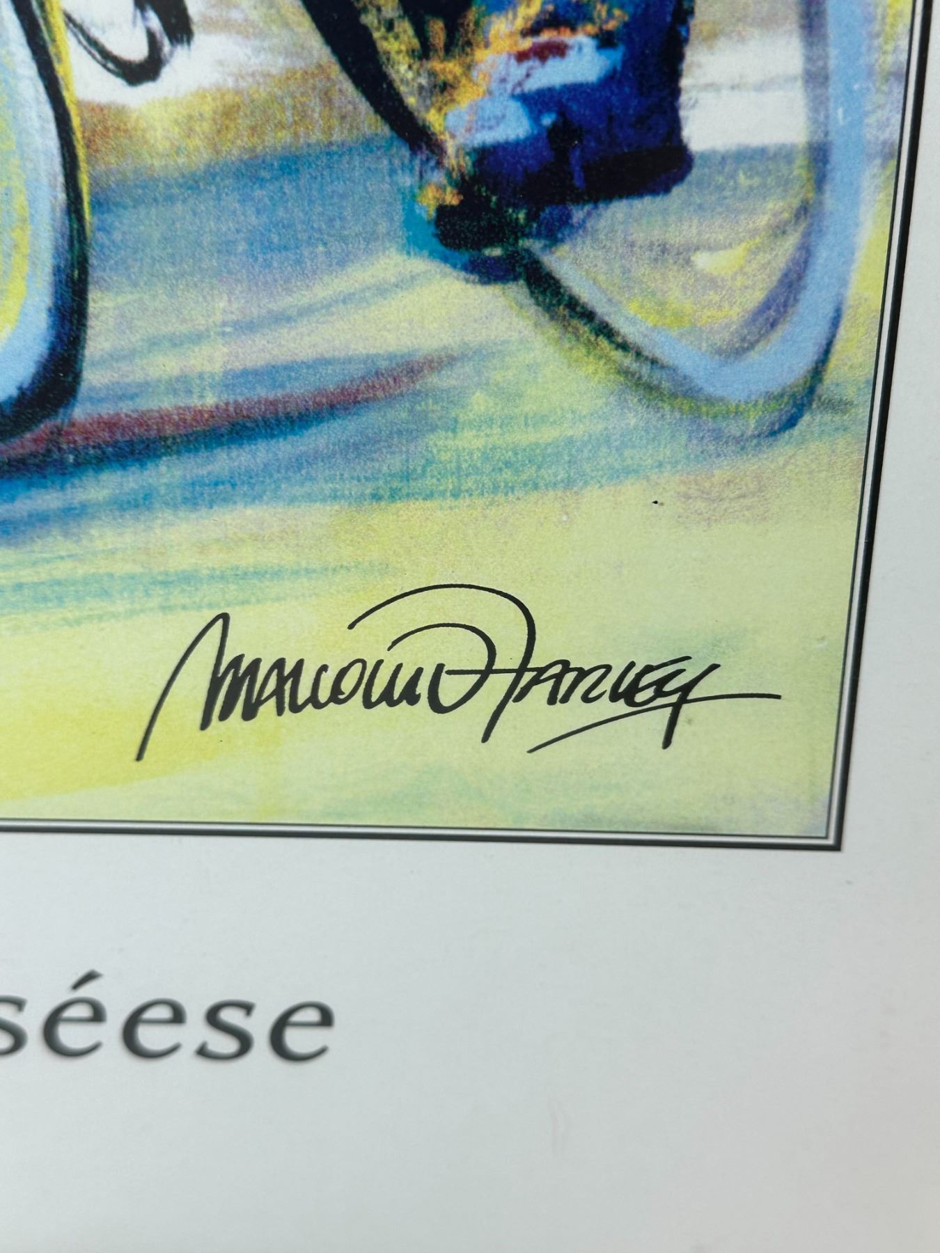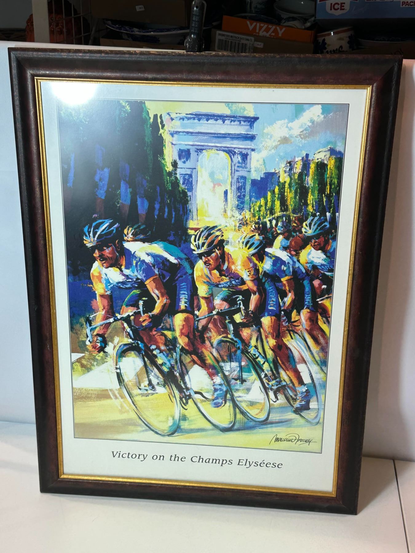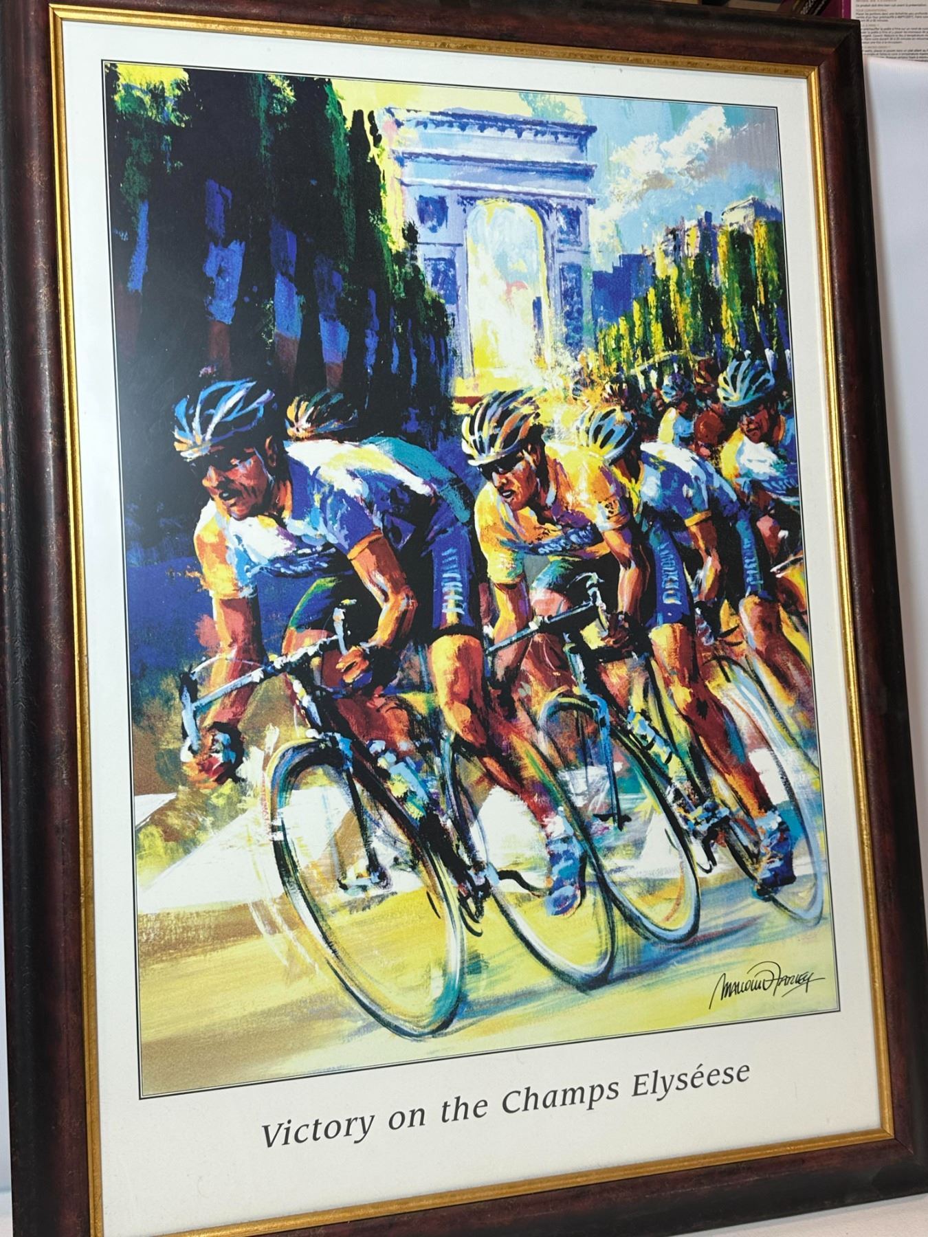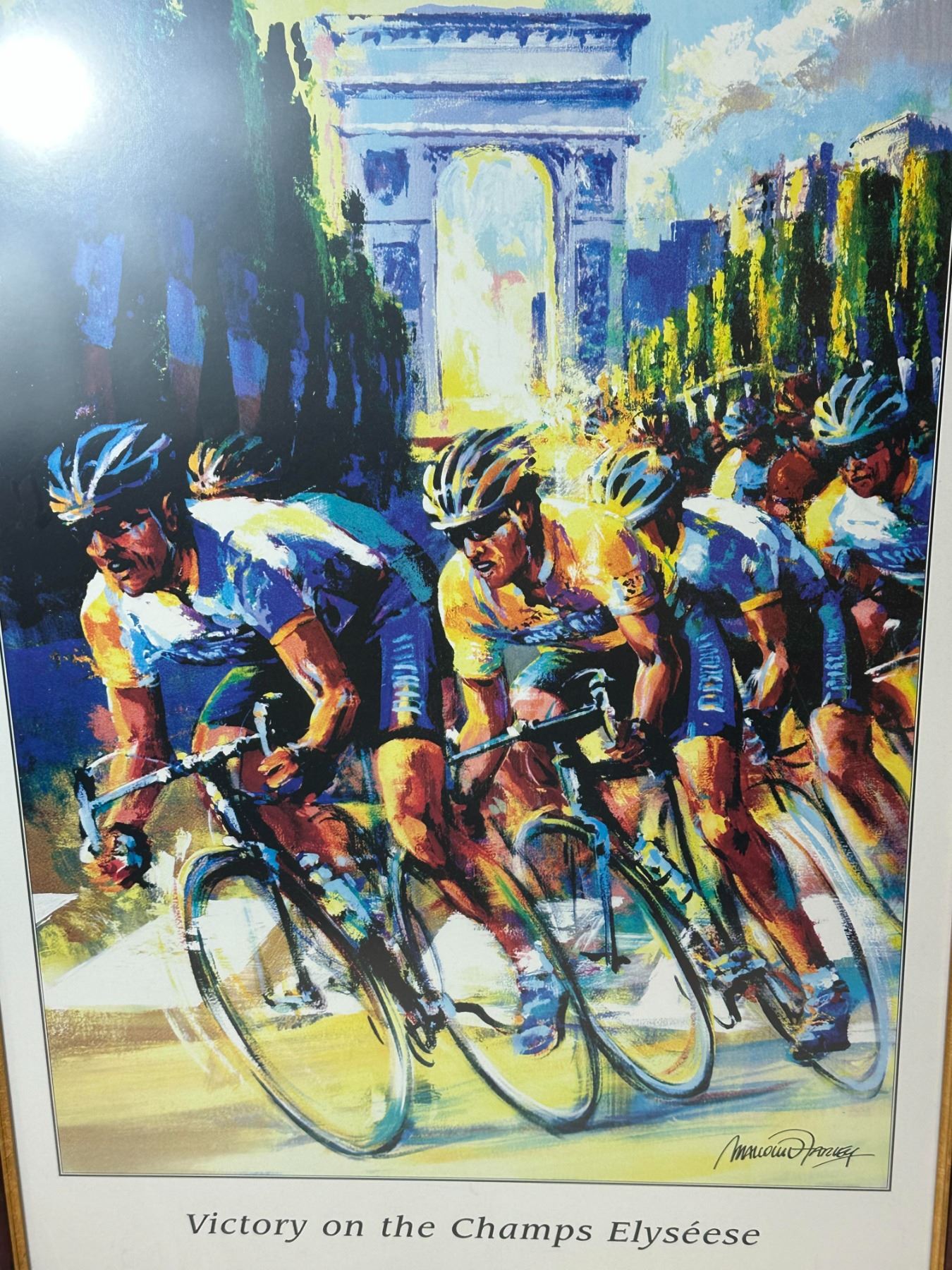 Framed art print depicting competitive cyclists racing on the Champs Élysées with Arc de Triomphe in background. Titled 'Victory on the Champs Élysées' and signed in print. Nicely matted and framed, ready to display.