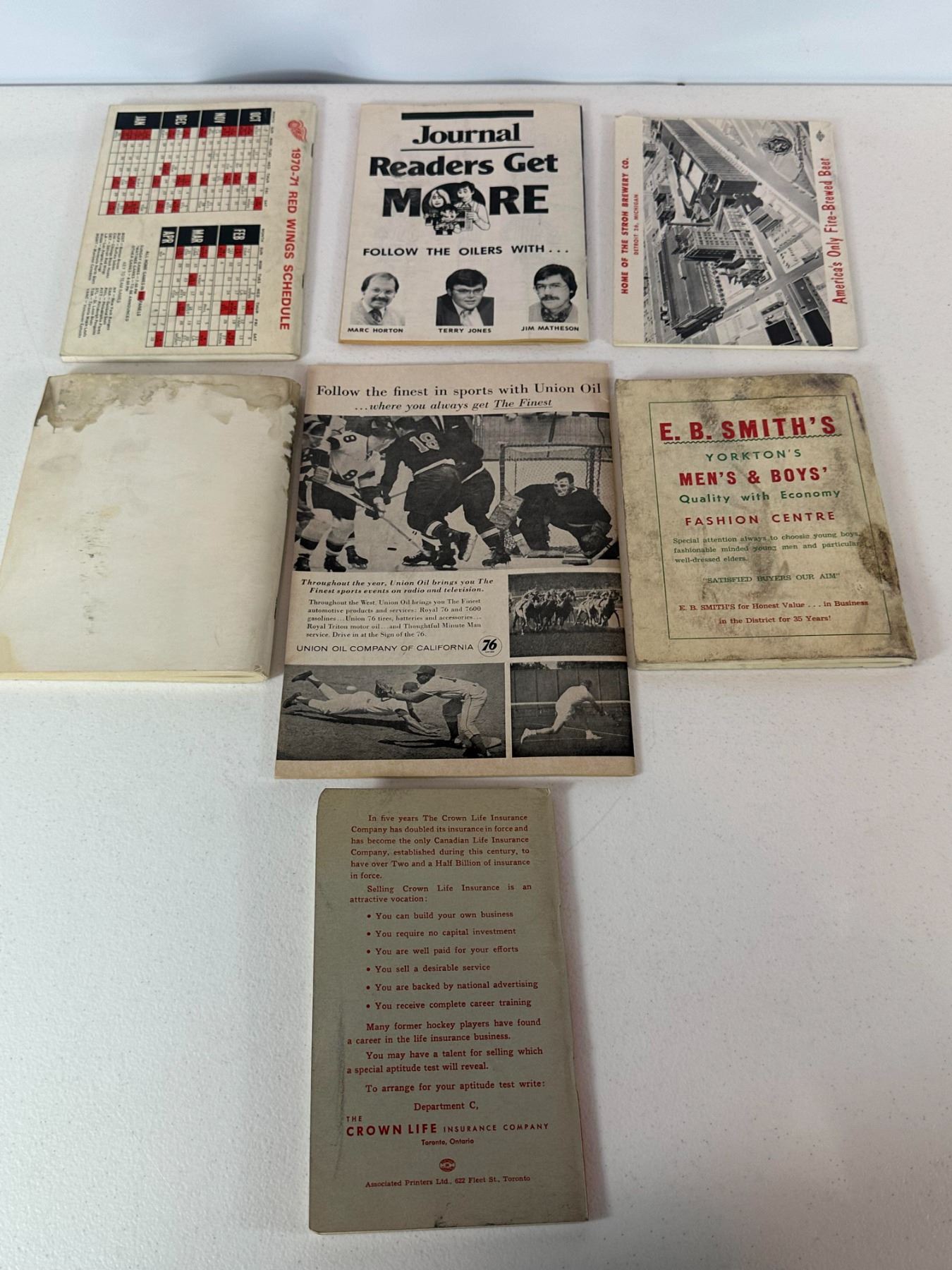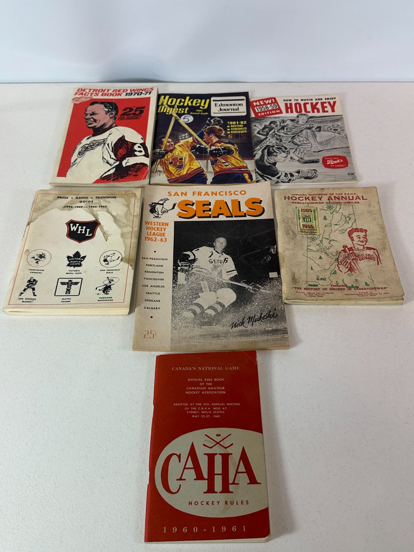 Collection of 7 vintage hockey booklets and publications dating from the late 1950s and onward. Includes Detroit Red Wings Facts Book (1970-71), Hockey Digest (1981-82), 1958-59 Hockey guide, WHL press/radio guide (1948-1965), San Francisco Seals program (1962-63), Saskatchewan Hockey Annual, and 1960-61 CAHA rule book. Shows age-related wear. Nice mix of early hockey publications.