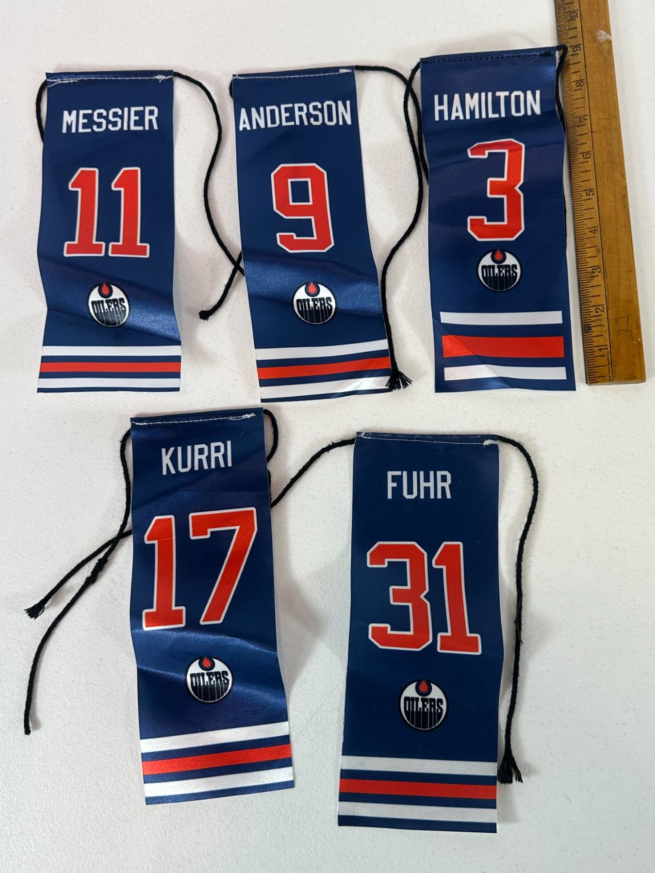 Set of 5 Edmonton Oilers mini player banners featuring Messier (#11), Anderson (#9), Hamilton (#3), Kurri (#17), and Fuhr (#31). Fabric banners with drawstrings. Nice collectible set featuring key Oilers players from the dynasty era.