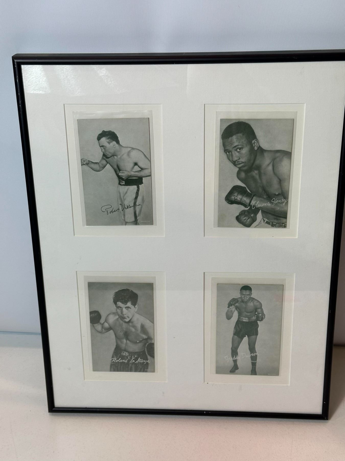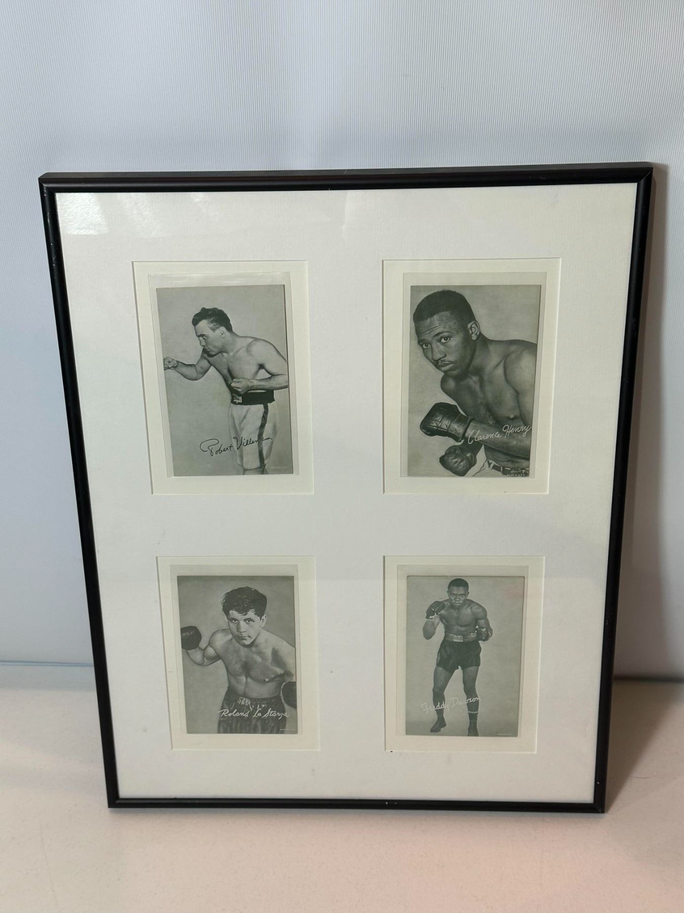Framed collection featuring four vintage black-and-white boxing portrait photographs, each depicting a professional fighter in classic pose with printed facsimile signatures. Beautifully matted and presented in a single frame, this piece highlights historic boxing figures and makes an उत्कृष्ट display for sports memorabilia collectors and boxing enthusiasts.