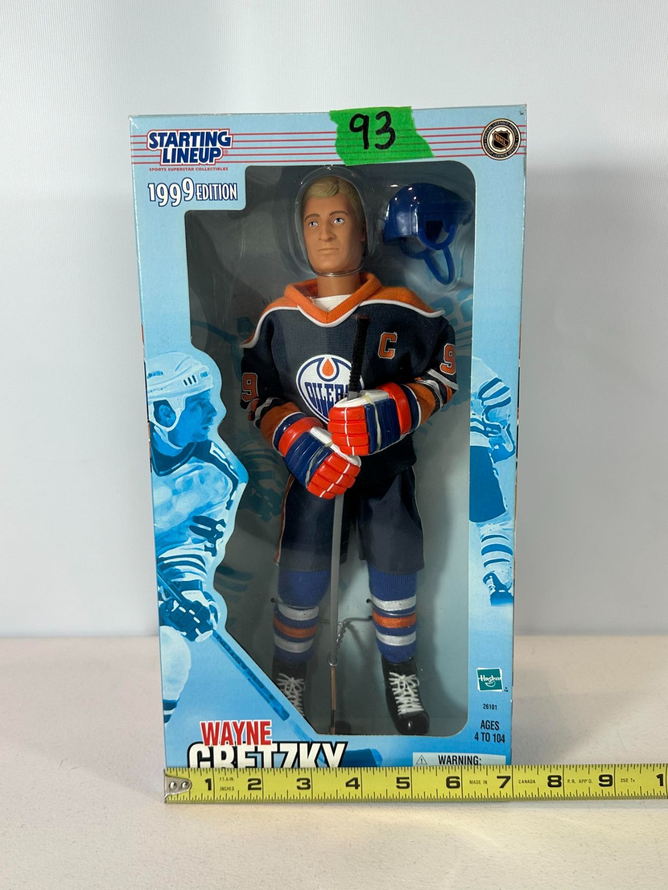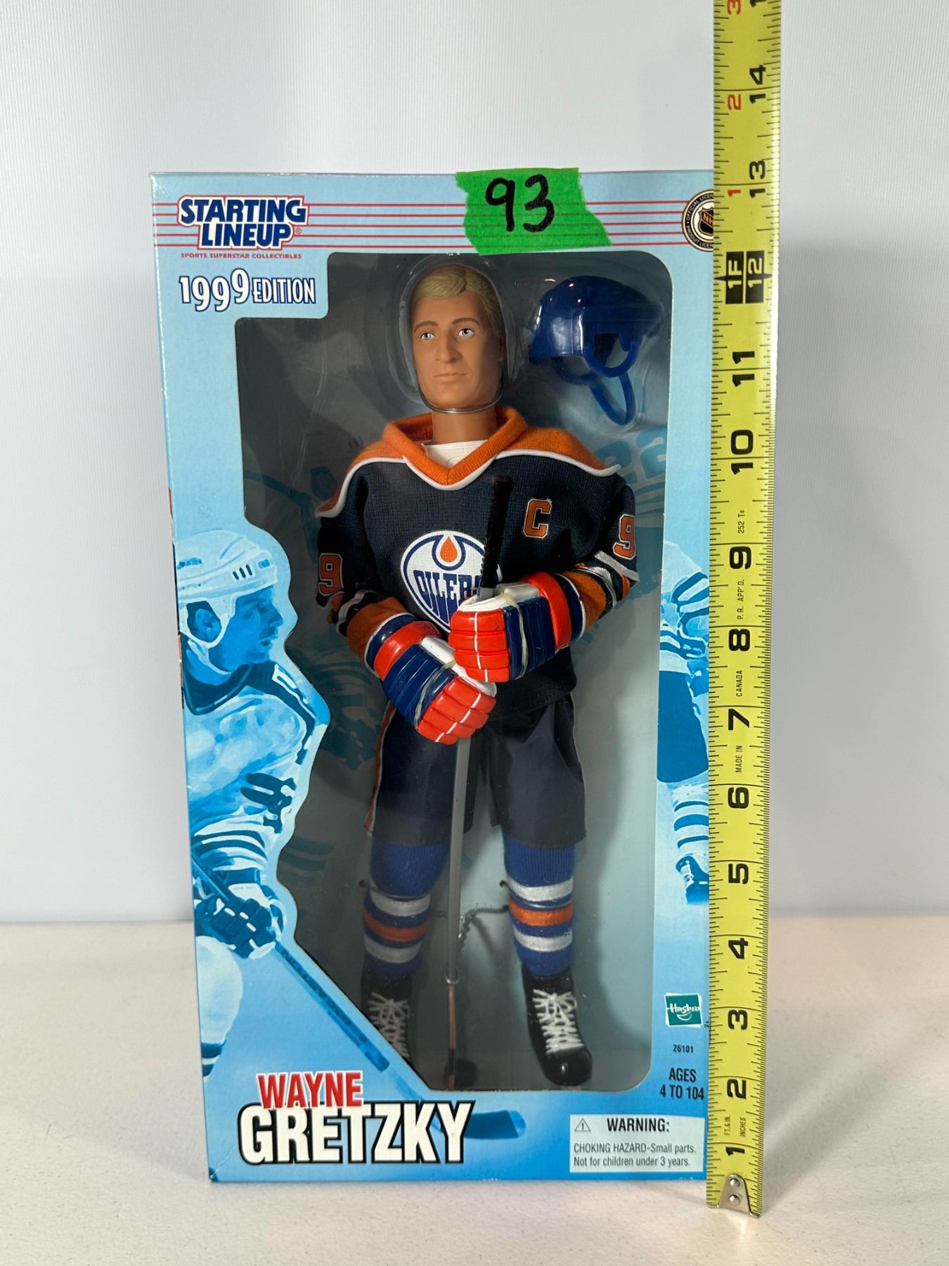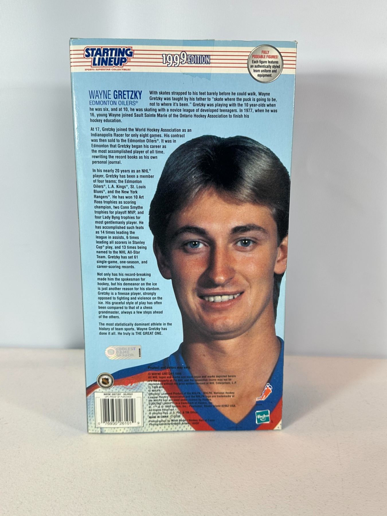 New old stock (NOS) 12-inch limited edition Wayne Gretzky action figure in Edmonton Oilers uniform. Officially licensed NHL collectible from the Starting Lineup series, complete with original packaging and accessories including helmet and stick. A classic collectible representing Gretzky’s iconic Oilers era, ideal for hockey fans and memorabilia collectors.