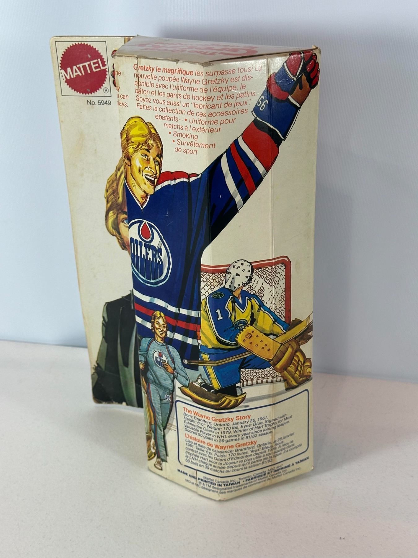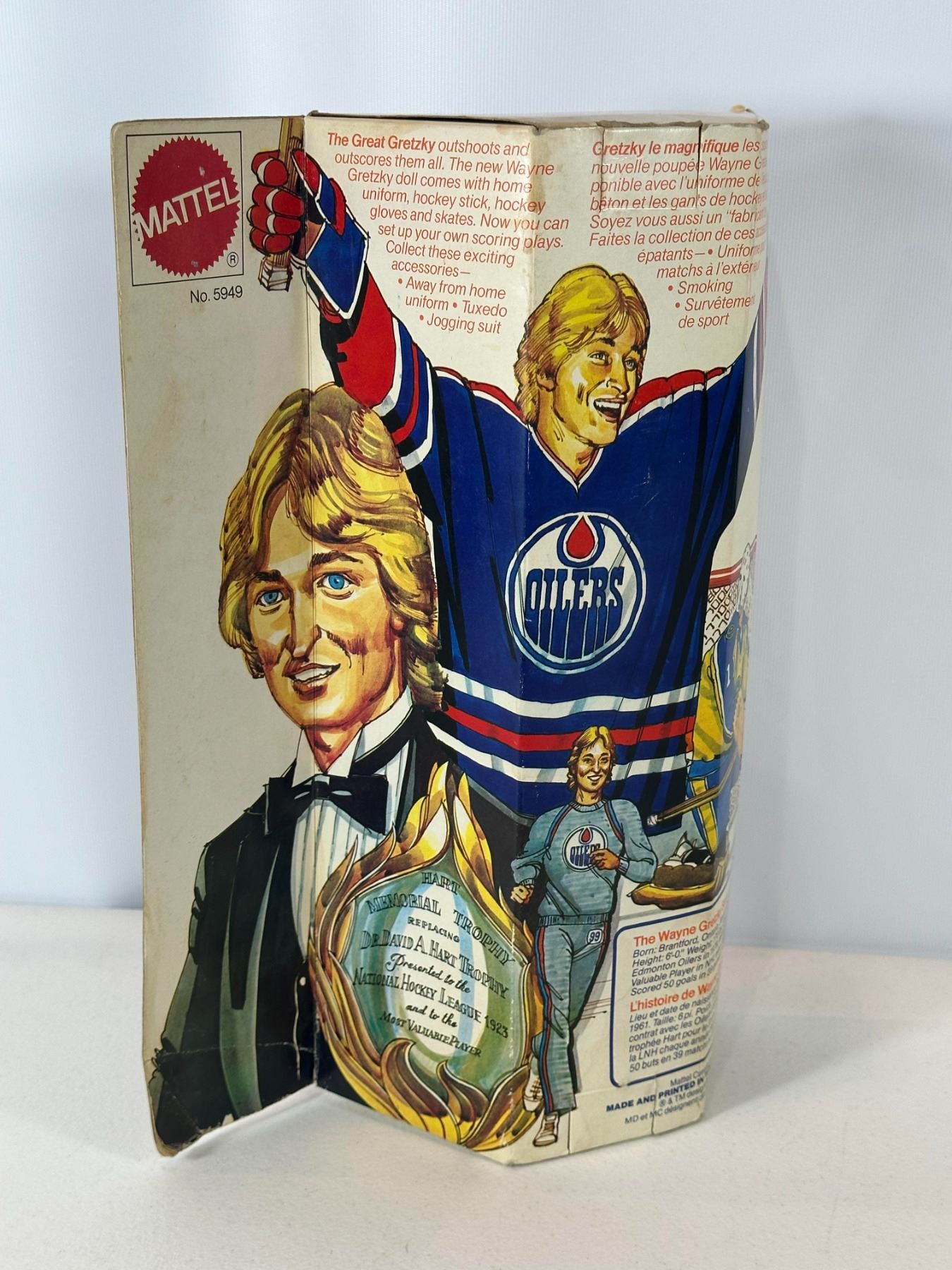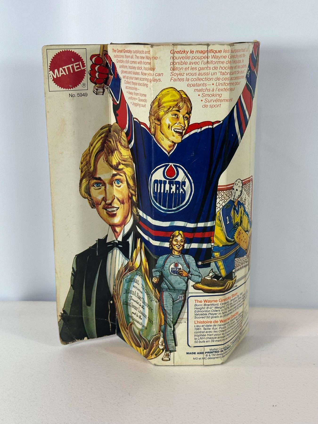 New old stock (NOS) rare early Wayne Gretzky 12-inch doll produced by Mattel, featuring Edmonton Oilers uniform. Original vintage packaging with 'The Great Gretzky' branding. Shows early career likeness of Gretzky, making it a highly desirable and nostalgic collectible for serious hockey and Gretzky collectors.