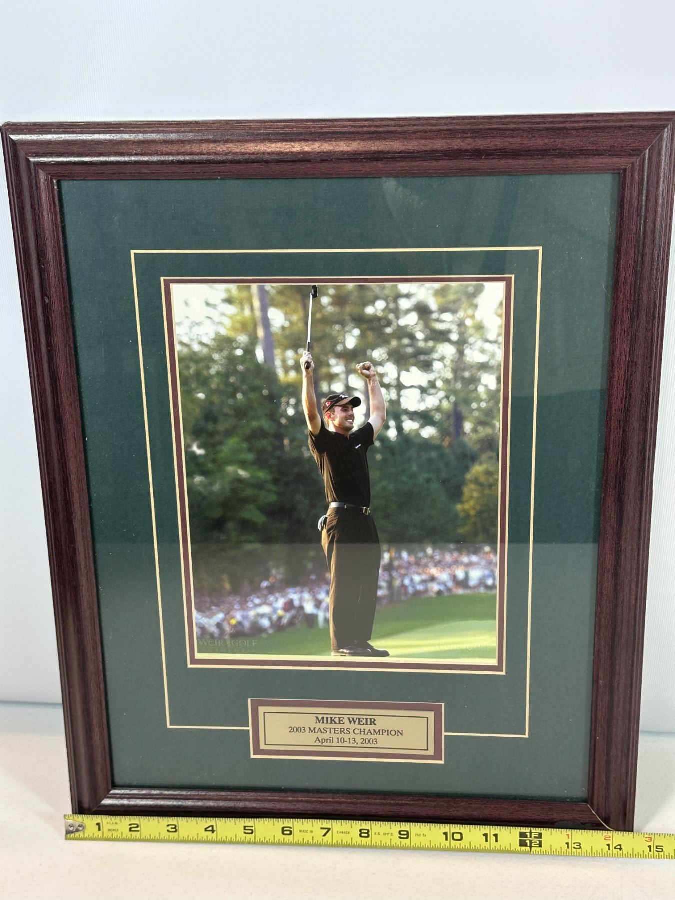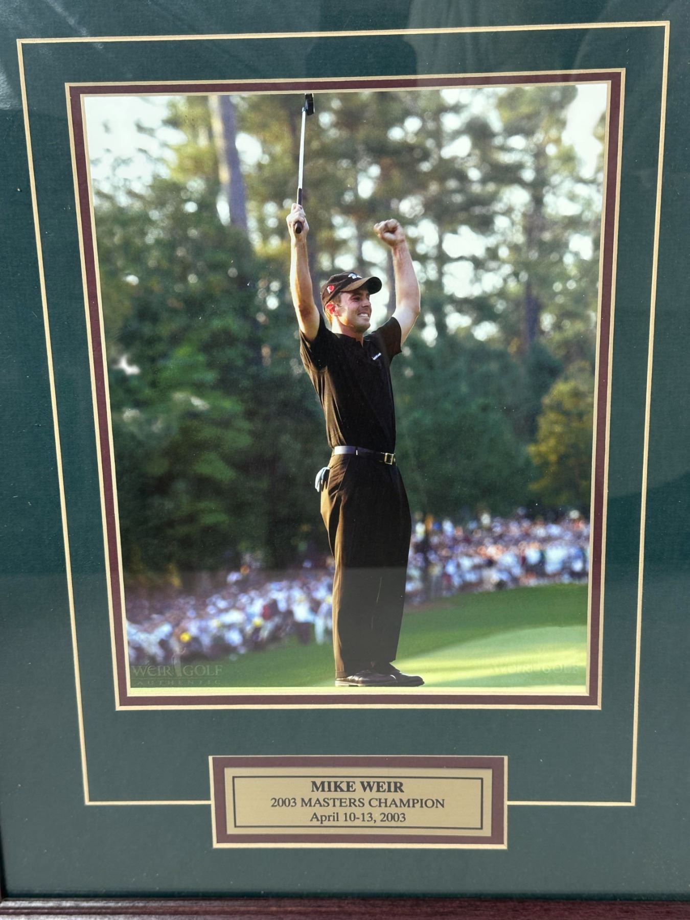 Framed display featuring Mike Weir celebrating his victory at the 2003 Masters Tournament. Includes a high-quality photograph and engraved plaque noting '2003 Masters Champion, April 10–13, 2003'. A great collectible piece for golf fans and memorabilia collectors, commemorating a historic Canadian golf achievement.
